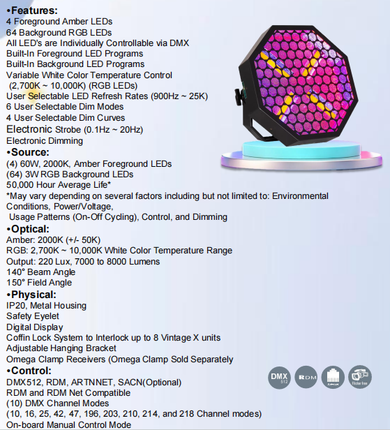 Variable White Color Temperature: Offers a wide range of white color temperatures (2,700K to 10,000K), providing flexibility in creating different moods and atmospheres.