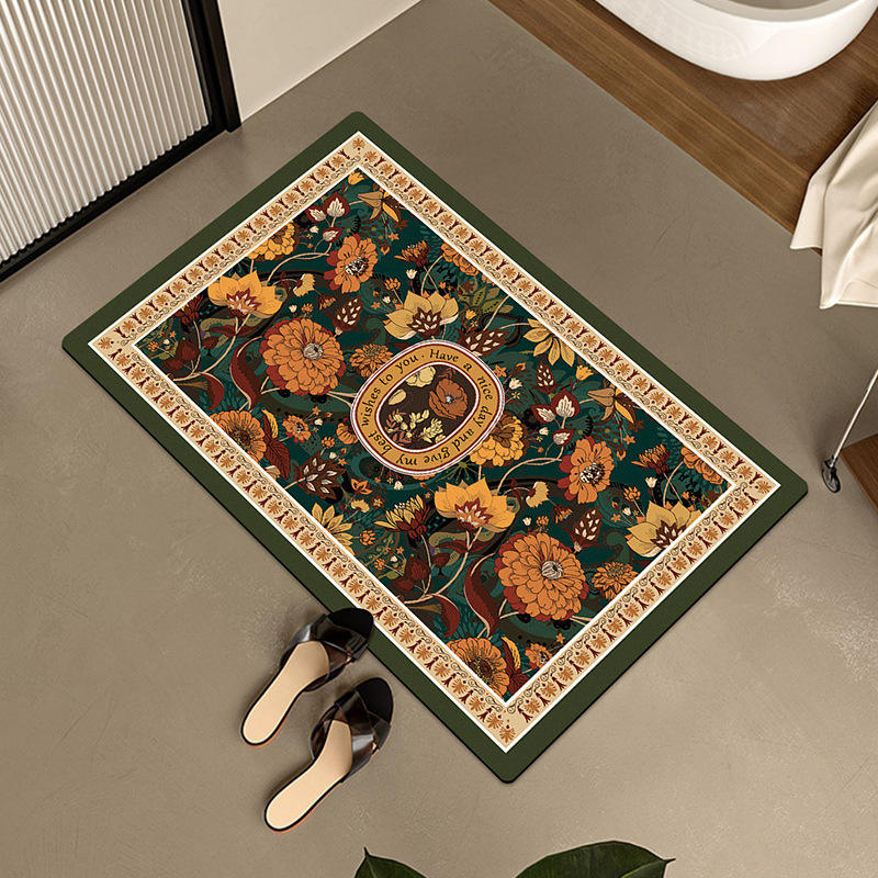พรมเช็ดเท้าลายดอกไม้สไตล์เรโทร รูปทรงสี่เหลี่ยมผืนผ้า ทำจากดินไดอะตอมเมียซ ดูดซับน้ำได้ดี กันลื่น สำหรับห้องน้ำ