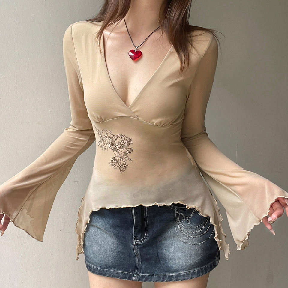 เสื้อยืดแขนยาวพิมพ์ลายดอกไม้สไตล์วินเทจสำหรับผู้หญิง รุ่นใหม่ล่าสุด ทรงไม่สมมาตร ผ้าตาข่ายโปร่งบาง ระบายอากาศได้ดี ทรงเข้ารูป เซ็กซี่ คอวี