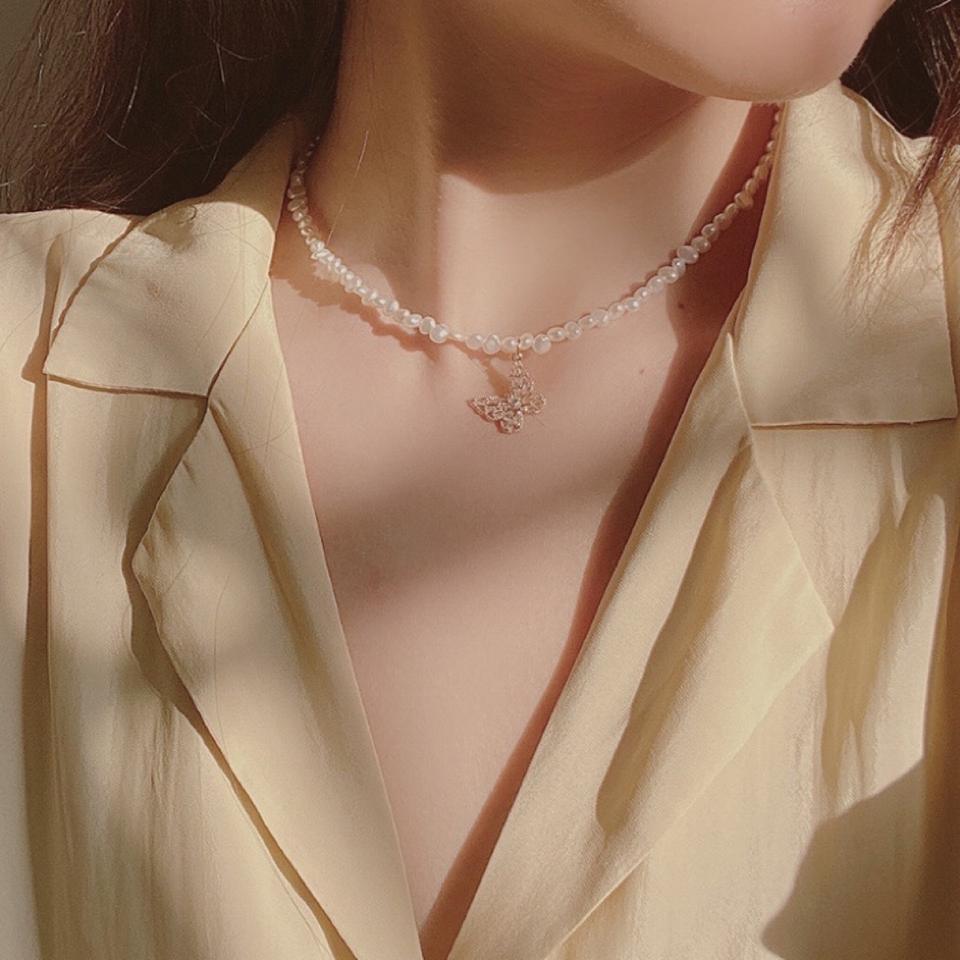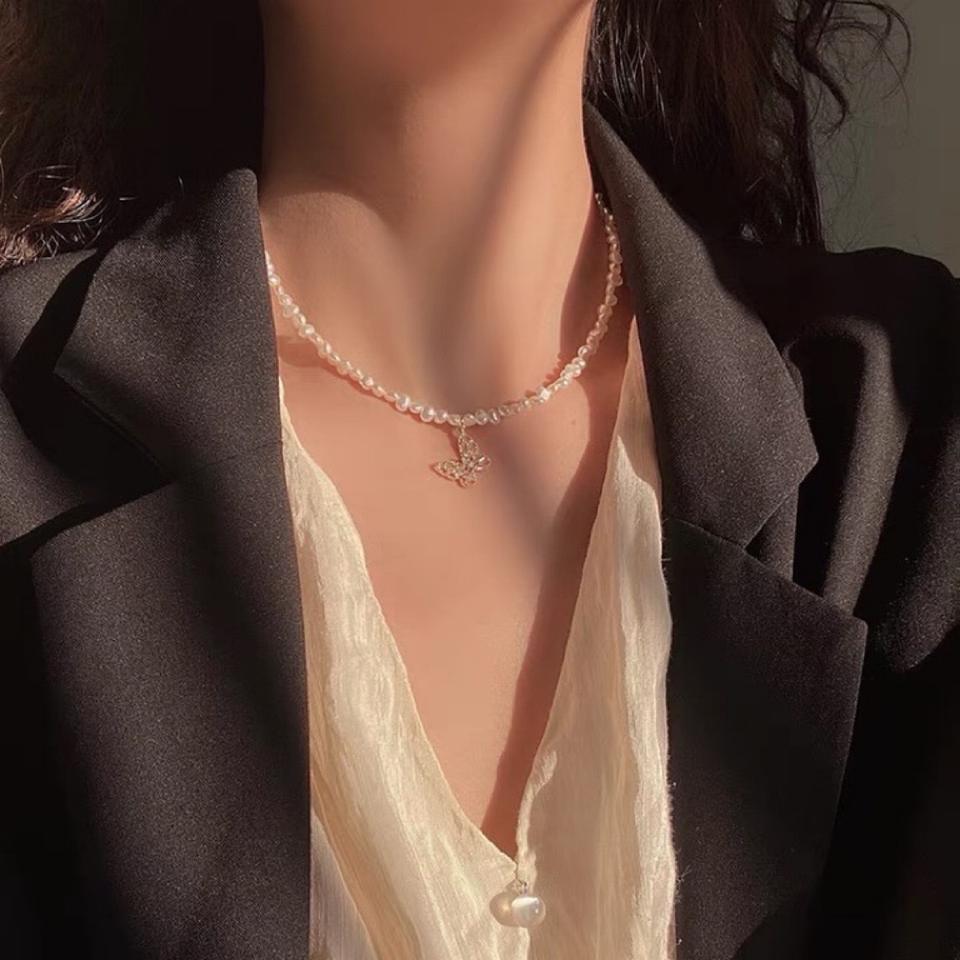 สร้อยคอมุกน้ำจืดสไตล์เรโทร ประดับเพชรซิคอนรูปทรงไม่สมมาตร พร้อมจี้รูปผีเสื้อ ดีไซน์สวยหวาน สไตล์แฟชั่น