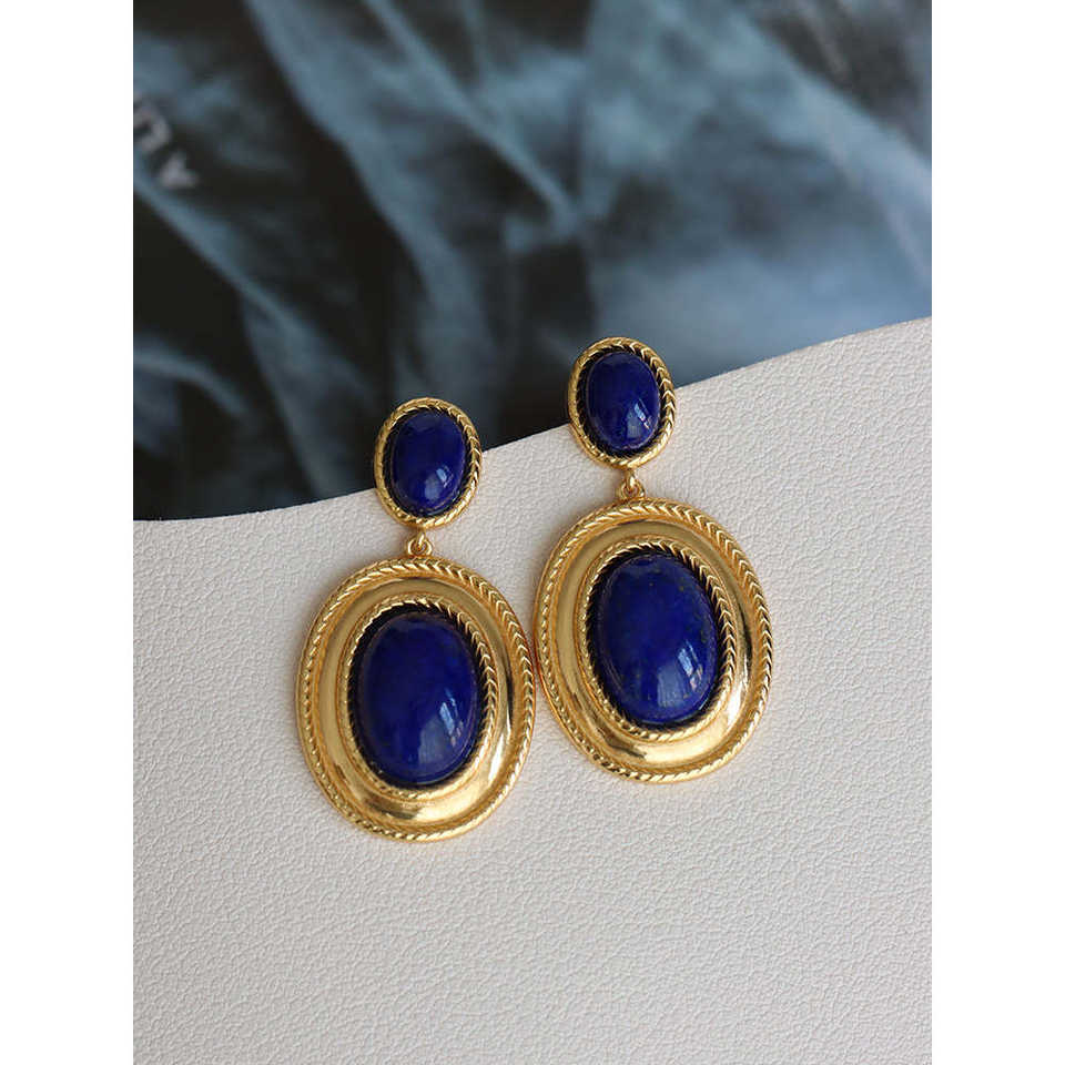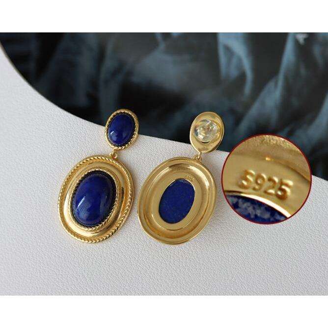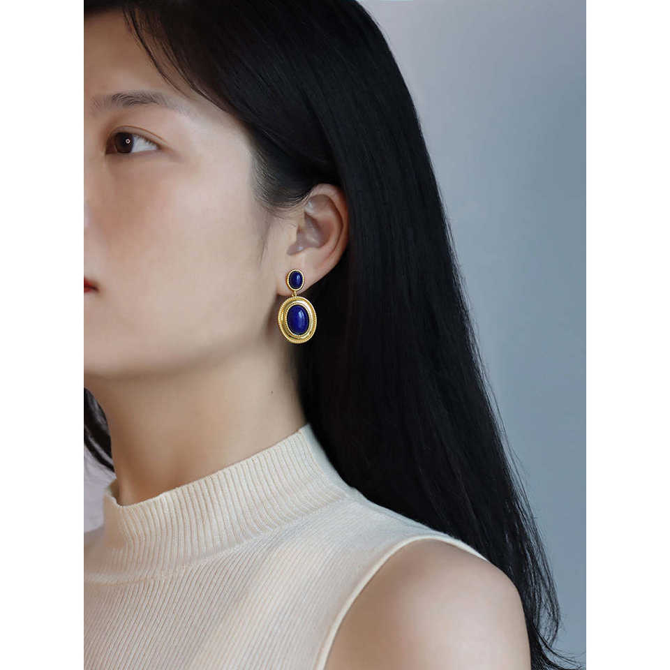 ต่างหูแบบติดหูดีไซน์หรูหราสไตล์ฮ่องกงย้อนยุค ประดับด้วยลาพิส ลาซูลีแท้ ชุบเงิน ของขวัญสำหรับผู้หญิง เหมาะสำหรับงานปาร์ตี้