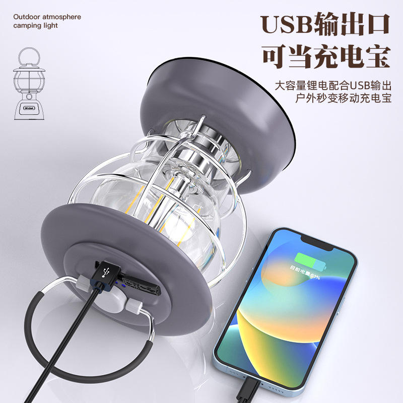 โคมไฟย้อนยุคแบบชาร์จไฟได้ ไฟแคมป์ปิ้ง LED แสงวอร์มไวท์ พกพาสะดวก ใช้สำหรับเต็นท์กลางแจ้ง พร้อมพอร์ตชาร์จ Type C