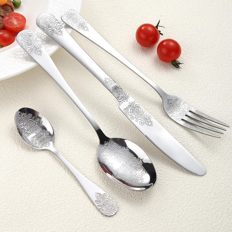 ชุดช้อนส้อมสแตนเลสหรูหราสไตล์เรโทร 4 ชิ้น ดีไซน์ลายนูน ชุดอาหารมื้อค่ำ มีด ส้อม ช้อน ของขวัญงานแต่งงาน