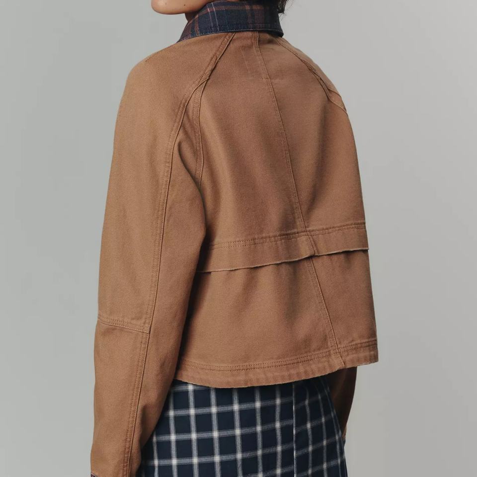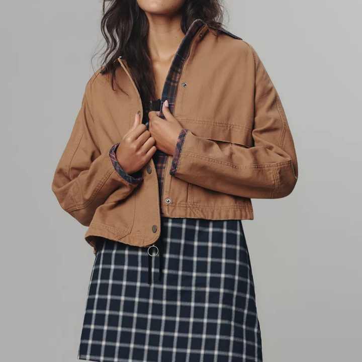 แจ็คเก็ตยีนส์ลำลองทรงหลวมสไตล์เรโทร ผ้าฝ้ายลายสก็อตเย็บต่อผ้ามุก แต่งลายปัก แบบครอป สำหรับผู้หญิง