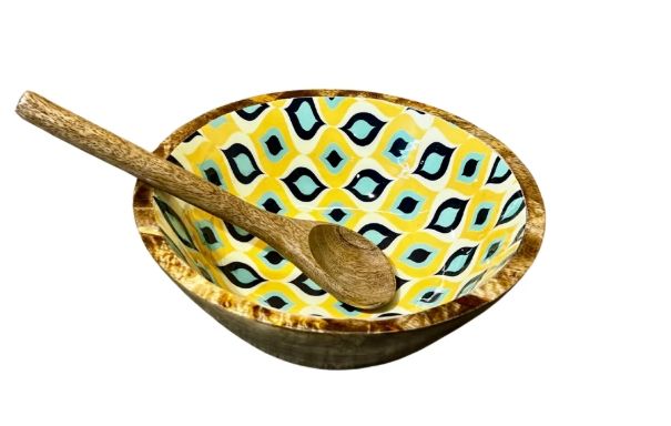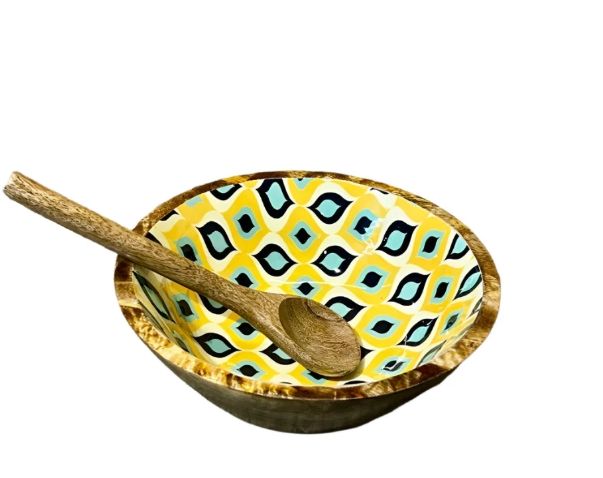 ชามไม้มะม่วงแบบย้อนยุคชามสลัดไม้ตกแต่งด้วยมือพร้อมเครื่องใช้ในการรับประทานอาหารไม้