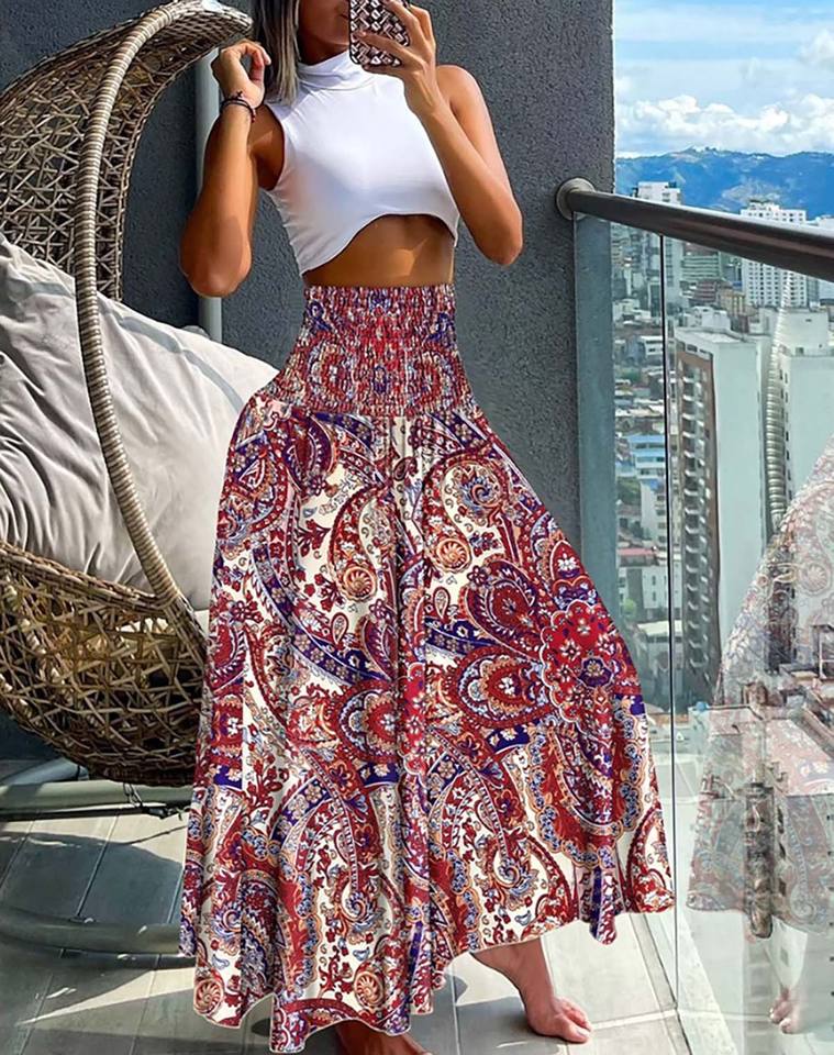 Retro Printed Maxi Skirt for Women - High Waist A-Line, Wide Elastic Waist, Loose Fit Long Skirt, Summer Flowy Style