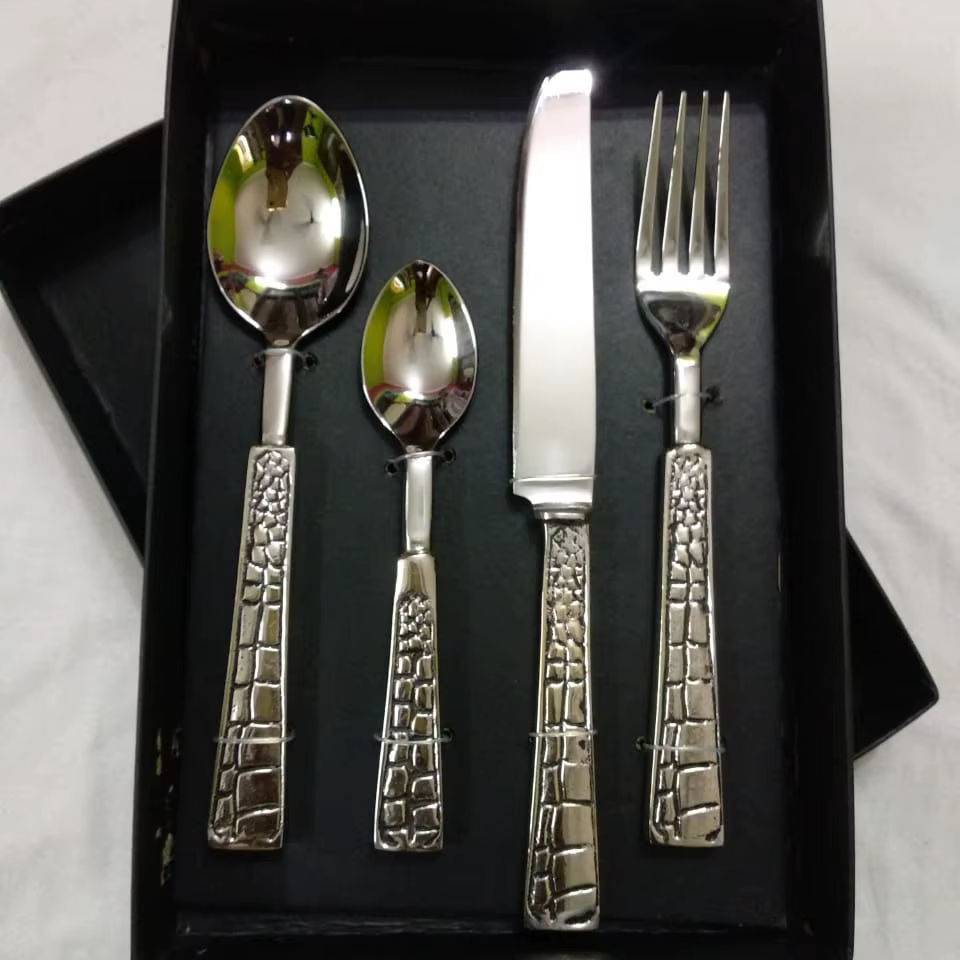 ชุดเครื่องเงินขัดเงาแบบย้อนยุคพร้อมกล่องของขวัญชุดเครื่องใช้บนโต๊ะอาหาร4ชิ้นเครื่องใช้บนโต๊ะอาหารสแตนเลสสำหรับโต๊ะงานเลี้ยงอาหารค่ำ