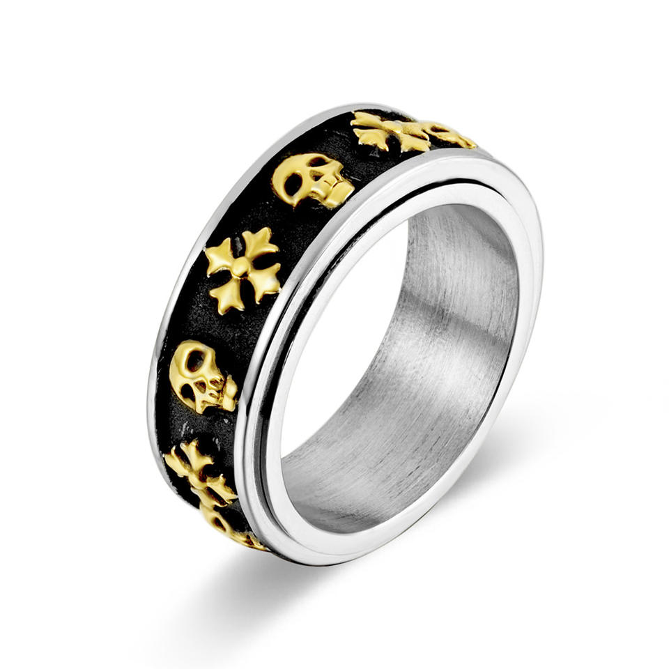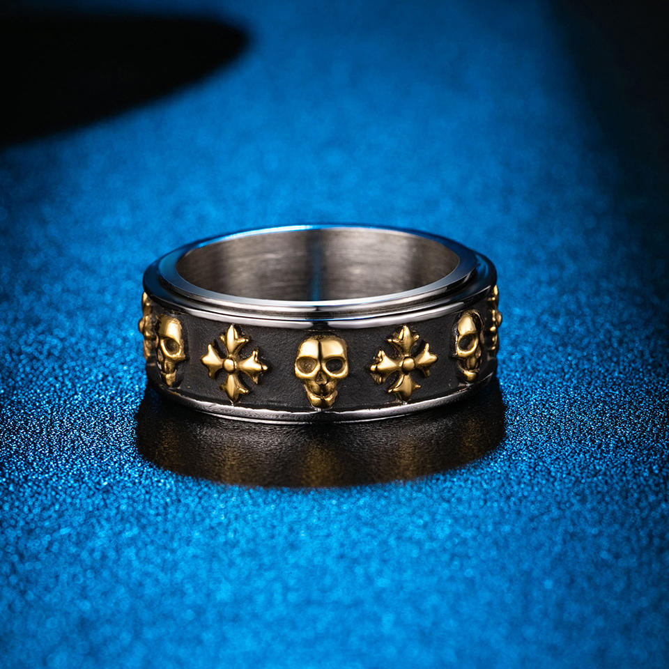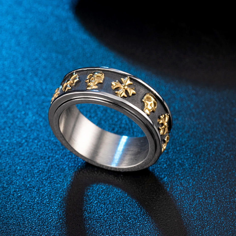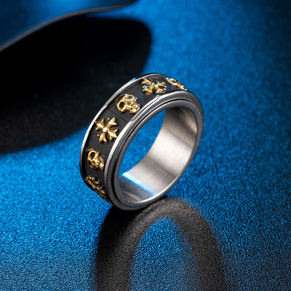 แหวนหมุนรูปหัวกะโหลกสไตล์เรโทรสำหรับผู้ชาย สีเงิน ดำ ทอง ประดับลายเรขาคณิต สไตล์ฮิปฮอป ของขวัญเครื่องประดับแฟชั่น แหวน K-R366