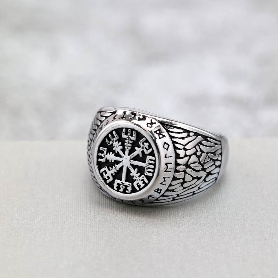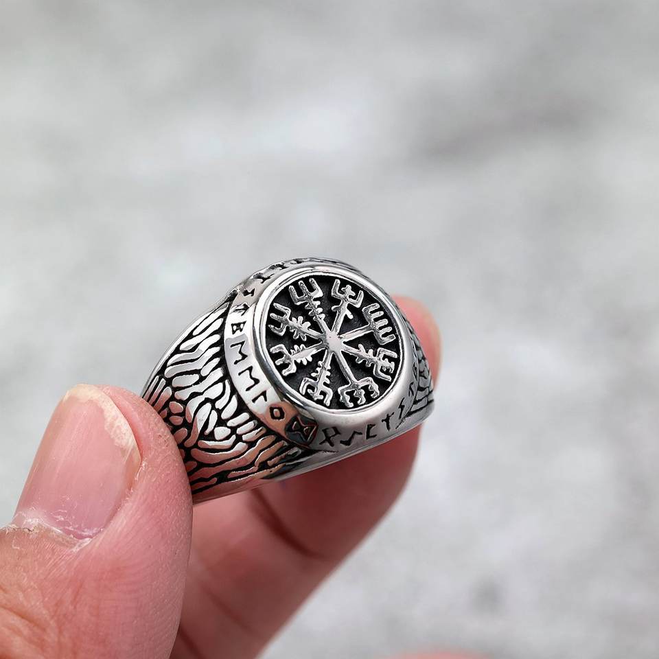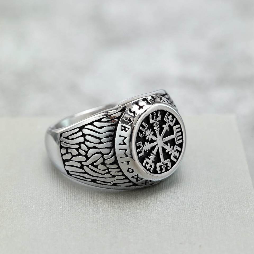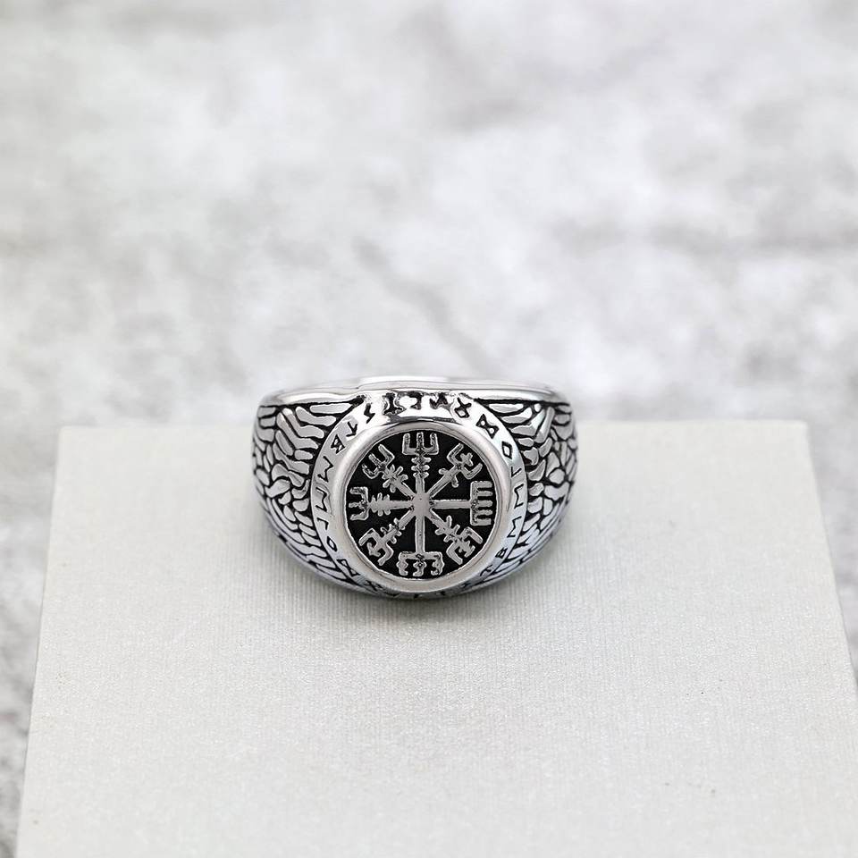 แหวนผู้ชายสแตนเลสย้อนยุค ลายเข็มทิศไวกิ้ง รูน ดีไซน์ทรงเรขาคณิต ของขวัญเครื่องประดับ