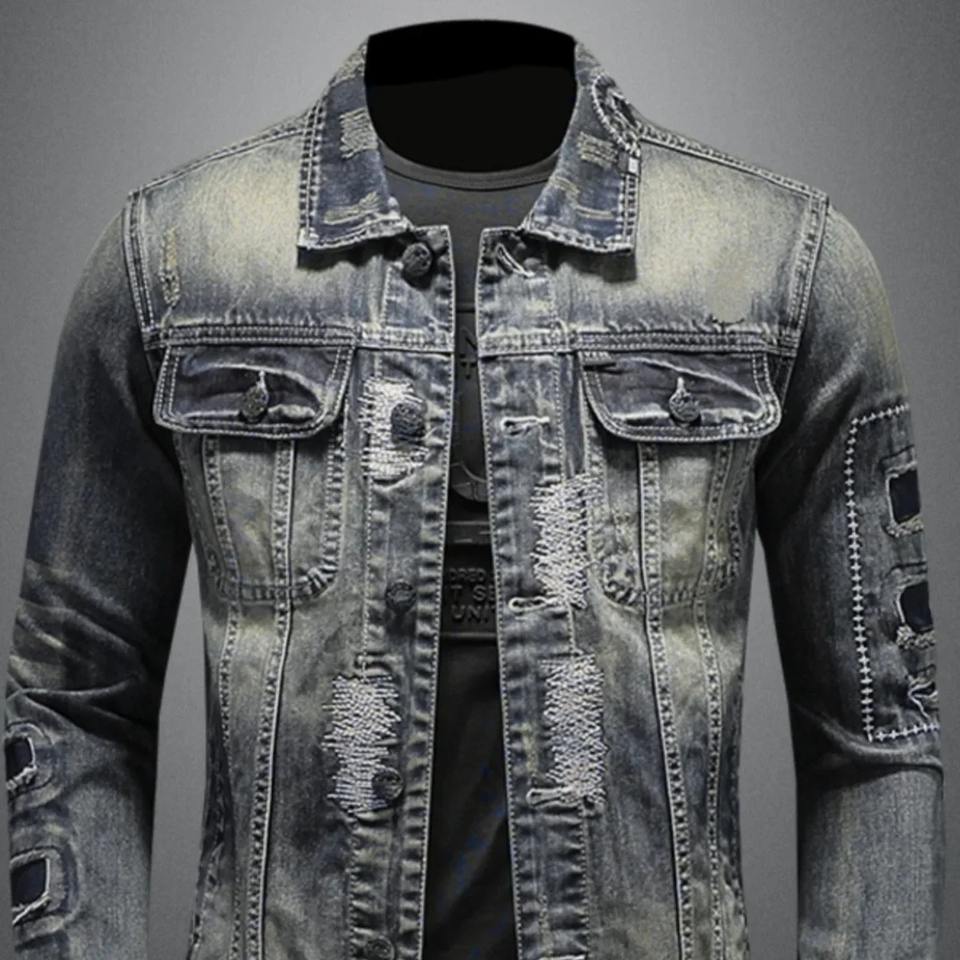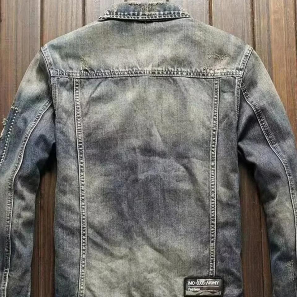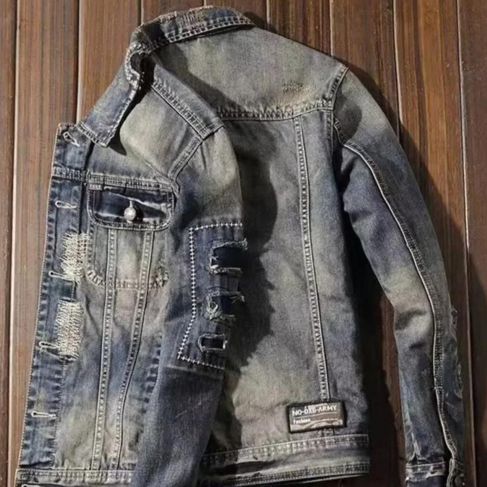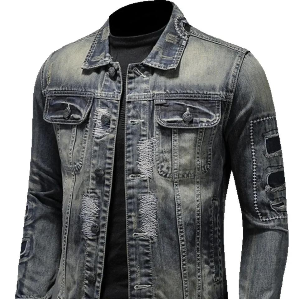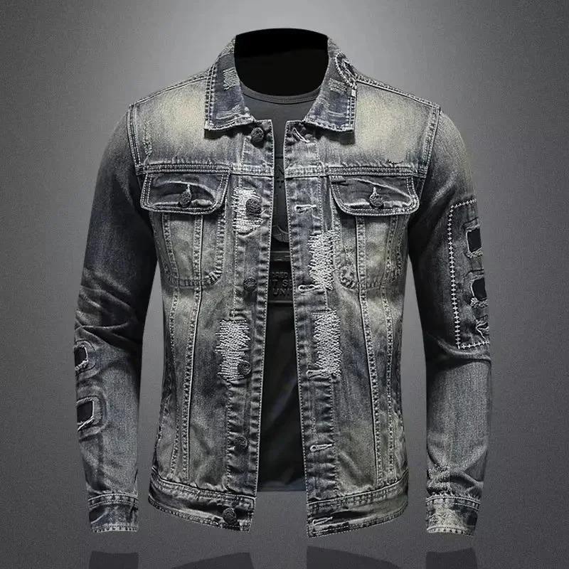 เสื้อแจ็กเก็ตผ้ายีนส์ทรงสลิมฟิตสำหรับผู้ชายสไตล์สตรีทแวร์ใส่ขี่มอเตอร์ไซค์เสื้อแจ็กเก็ตทรงหลวมลำลองสไตล์สตรีทแวร์