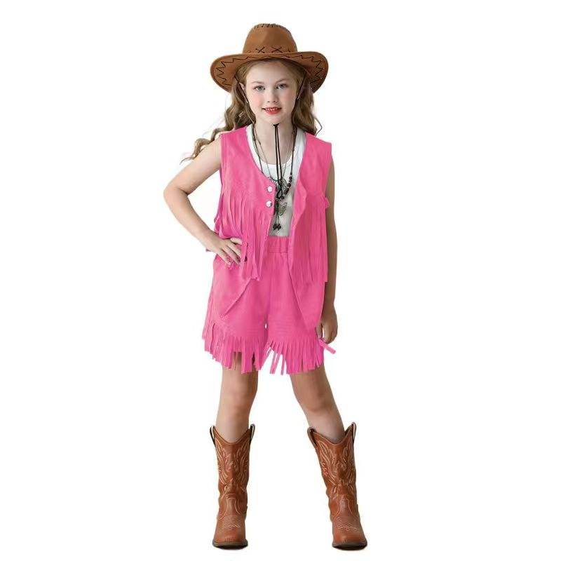 ชุดคอสตูมสไตล์เรโทรสำหรับเด็กผู้หญิง ชุดคาวเกิร์ลโบฮีเมียน เสื้อกั๊กและกางเกงยีนส์ขาสั้น สำหรับงานปาร์ตี้มาร์ดิกราส์