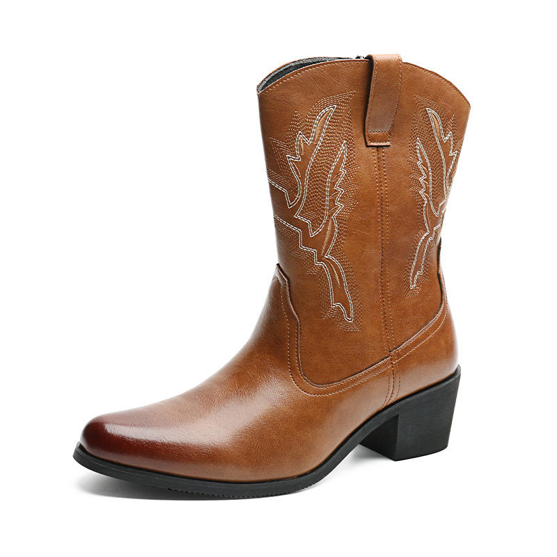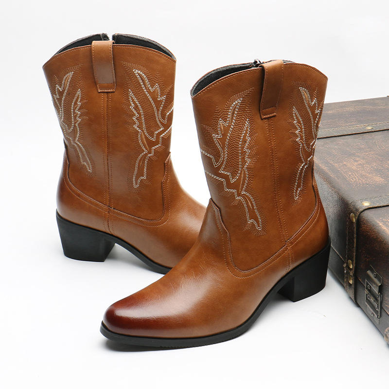 รองเท้าบูทสไตล์เรโทรแบบหุ้มข้อกลาง ไซส์ใหญ่ สำหรับผู้หญิงและผู้ชาย ส้นหนาปักลาย รองเท้าบูทแบบสวม สไตล์คาวบอยตะวันตกแบบสั่งทำ