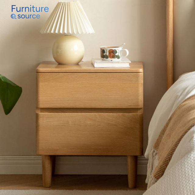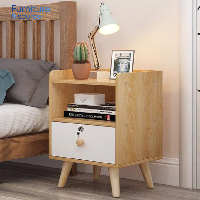 โต๊ะข้างเตียงสไตล์ย้อนยุคพร้อมชั้นวางแบบเปิดโล่งสินค้าจากโรงงานในเวียดนามดีไซน์ทูโทนสีขาวและไม้