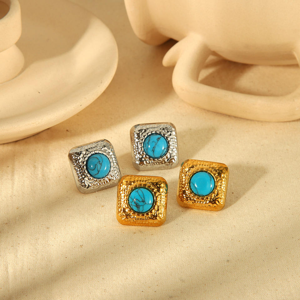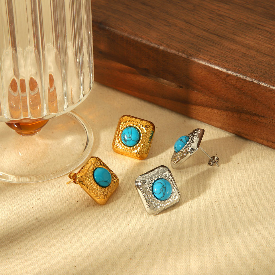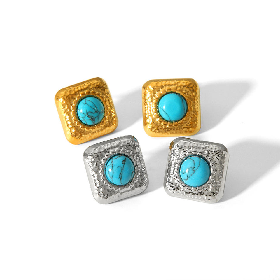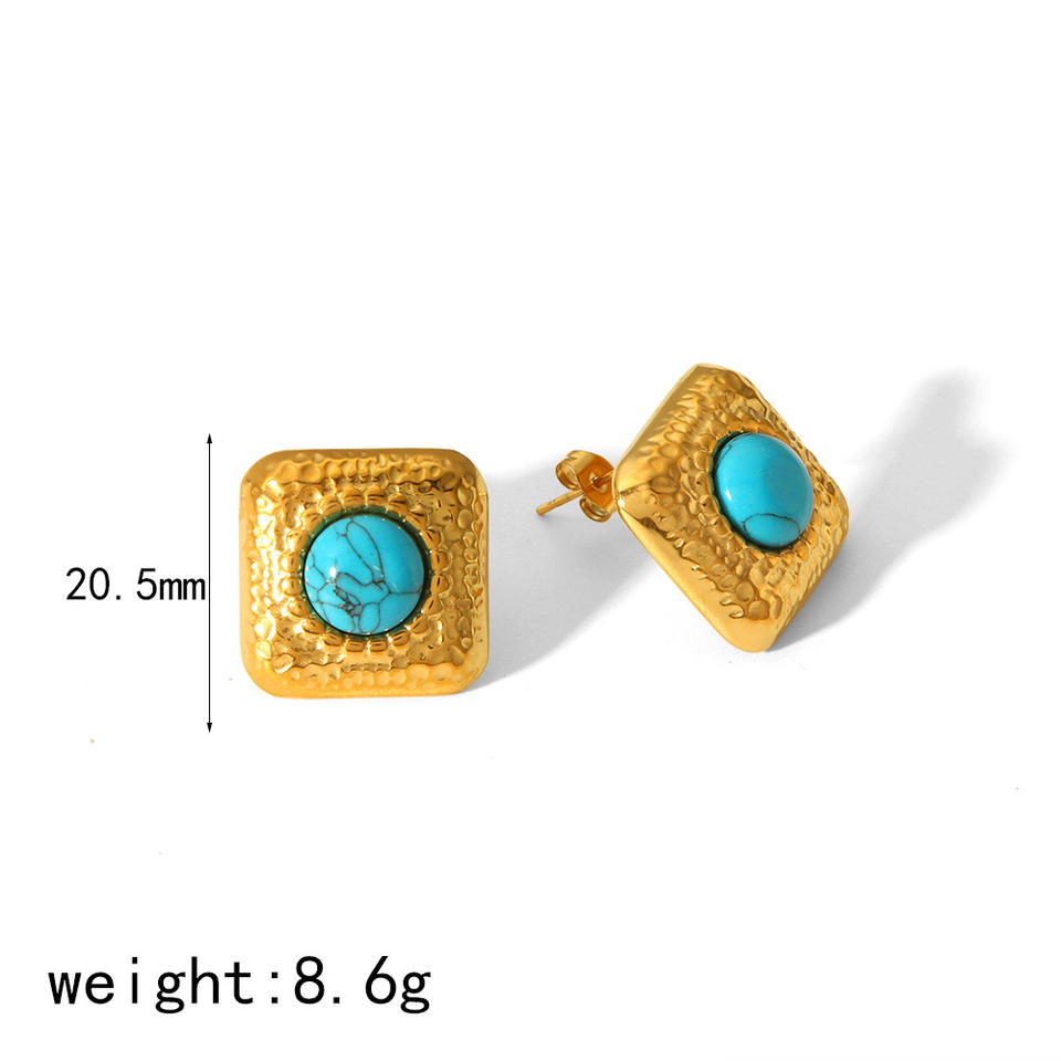 ต่างหูสตั๊ดเหล็กไทเทเนียมสไตล์ย้อนยุคพร้อมดีไซน์ทรงสี่เหลี่ยมเรขาคณิตสีเทอร์ควอยซ์ธรรมชาติสำหรับผู้หญิงเครื่องประดับแฟชั่น
