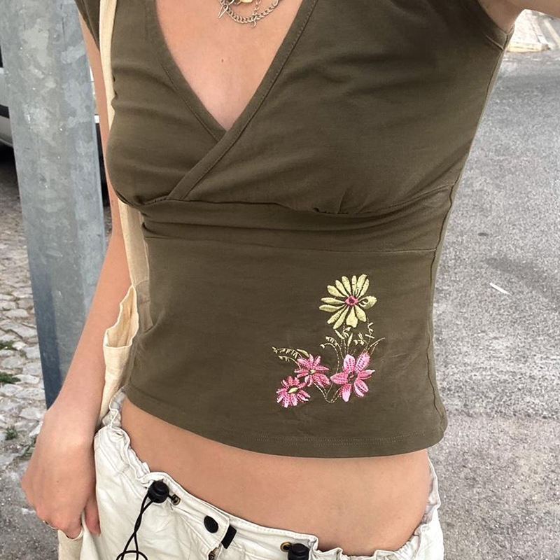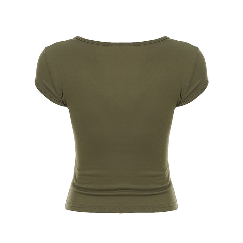 เสื้อยืดถักคอวีสไตล์วินเทจสำหรับผู้หญิง ระบายอากาศได้ดี พิมพ์ลายดิจิทัล สีพื้น แขนสั้น ปักลาย