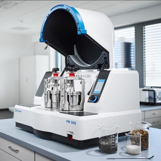 เครื่องบดแบบลูกบอลชนิดดาวเคราะห์ Retsch PM 300 กำลังไฟ 1.5 กิโลวัตต์ สำหรับบดแห้ง ทำจากสแตนเลส ใช้ไฟฟ้า แบบตั้งโต๊ะ สำหรับใช้ในห้องปฏิบัติการ