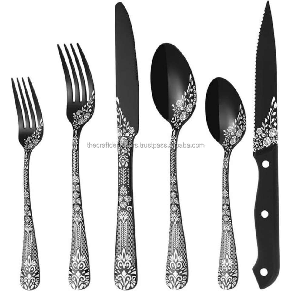 ชุดมีดและเครื่องเงินเคลือบสีดำอุปกรณ์ตกแต่งโต๊ะของใช้ในบ้านล่าสุด