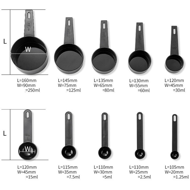 ชุดอุปกรณ์ทำขนมสำหรับครัวแบบใช้ซ้ำได้ 10 ชิ้น สีดำ ชุดถ้วยตวงและช้อนตวงพลาสติก พร้อมห่วงเก็บ