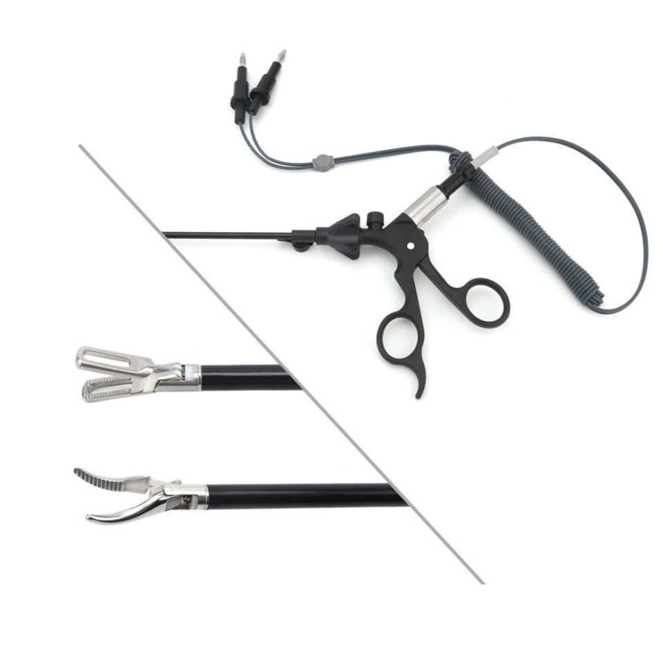 ชุดเครื่องมือผ่าตัดผ่านกล้องแบบใช้ซ้ำได้ ทำจากเหล็กกล้าไร้สนิมเกรดทางการแพทย์ พร้อมสายเคเบิลสำหรับการจี้ห้ามเลือดแบบไบโพลาร์ และเครื่องมือตัด สามารถนึ่งฆ่าเชื้อได้