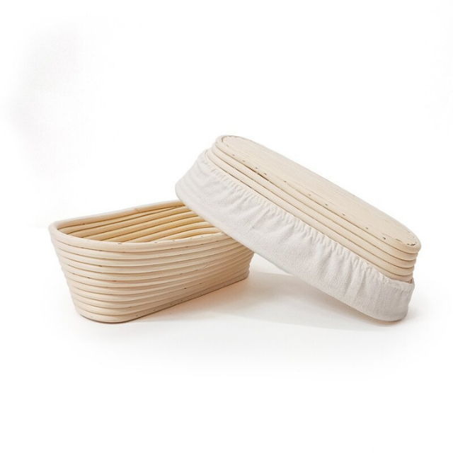 ตะกร้าหวายแบบนำกลับมาใช้ใหม่ได้พร้อมผ้าเรียงรายไปด้วยขนมปังอุปกรณ์หมักแป้งโดว์สำหรับใช้ในครัว