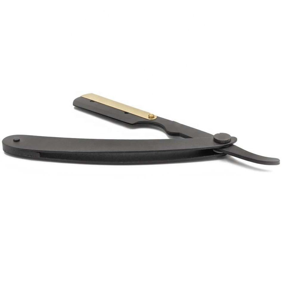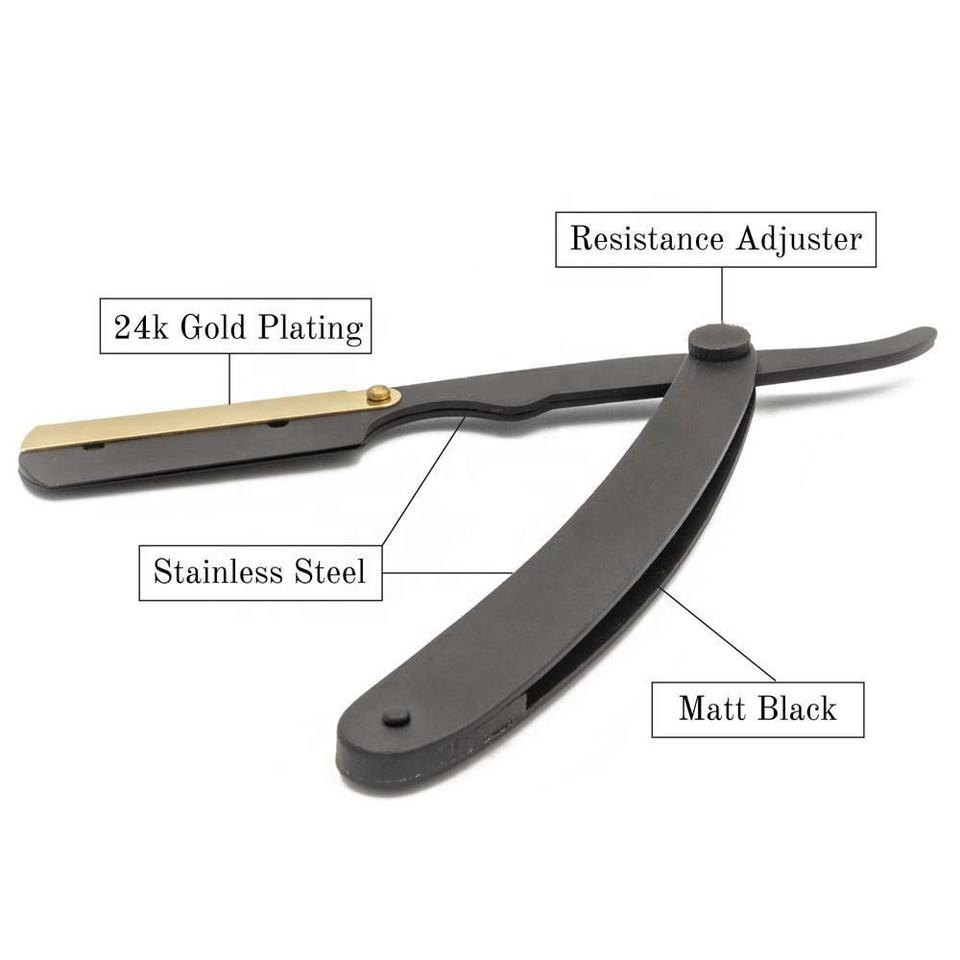 มีดโกนขอบตรงสีทองสีดำทำจากสแตนเลสมีดโกนหนวดพับได้ด้วยมือพร้อมเคสหนัง PU