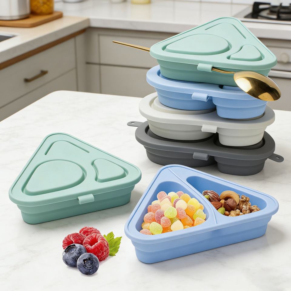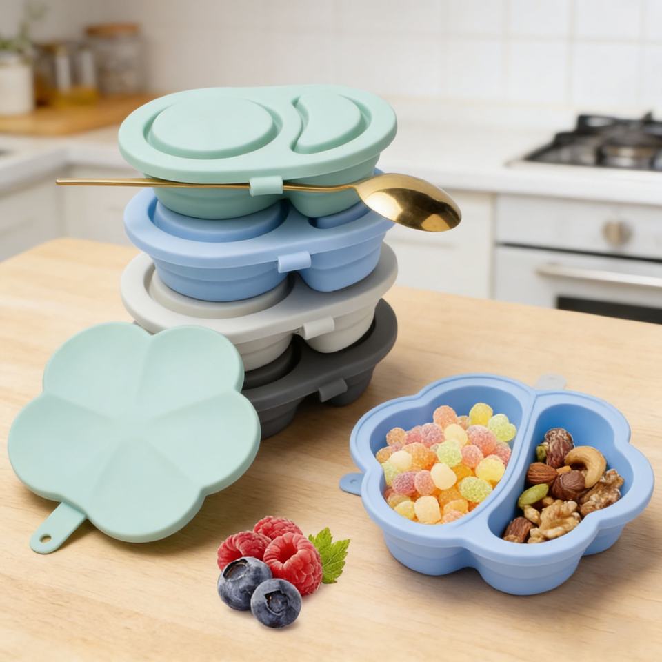 ภาชนะใส่ขนมซิลิโคนแบบใช้ซ้ำได้พร้อมฝาปิด ปลอดสาร BPA 2 ช่อง กล่องเก็บอาหารป้องกันการรั่วซึมสำหรับซอสสลัด