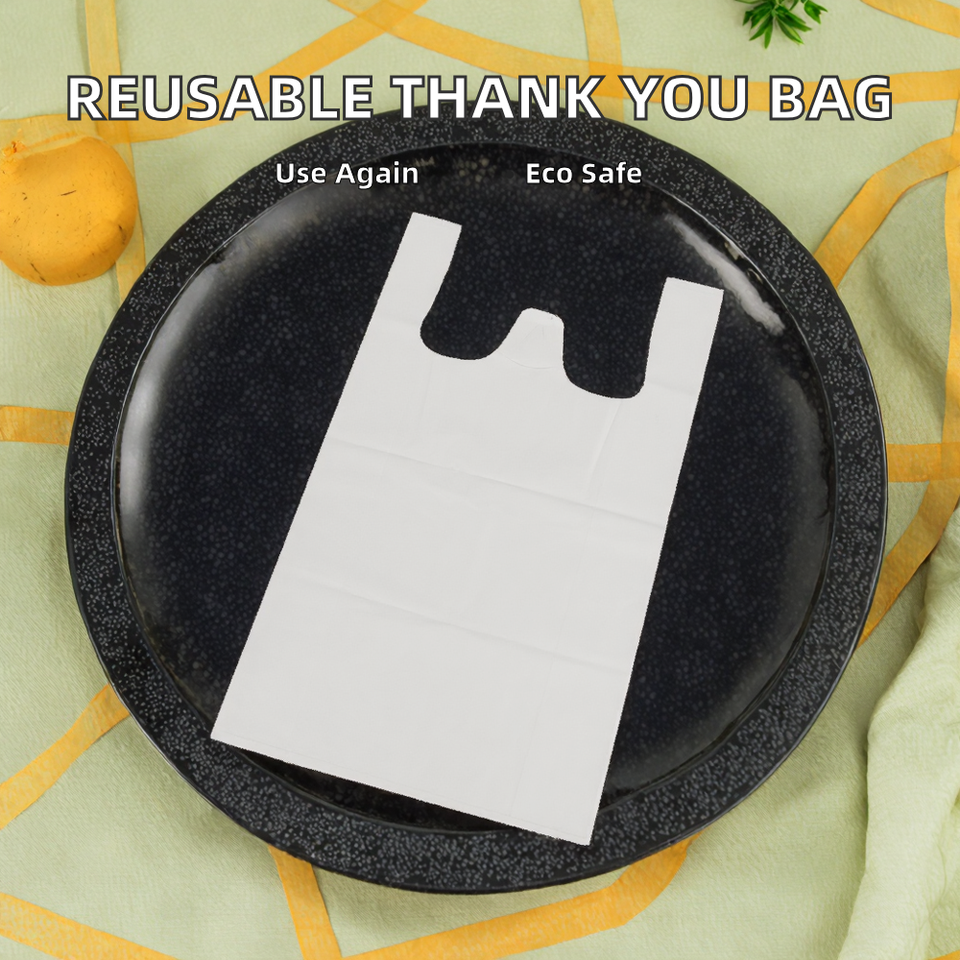 ถุงช้อปปิ้งเสื้อยืดแบบใช้ซ้ำได้ 2.5 มิล ผลิตจากวัสดุ LDPE ย่อยสลายได้ พิมพ์ลายกราเวียร์ หูหิ้วแบบยาว ปรับแต่งได้สำหรับงานนิทรรศการ