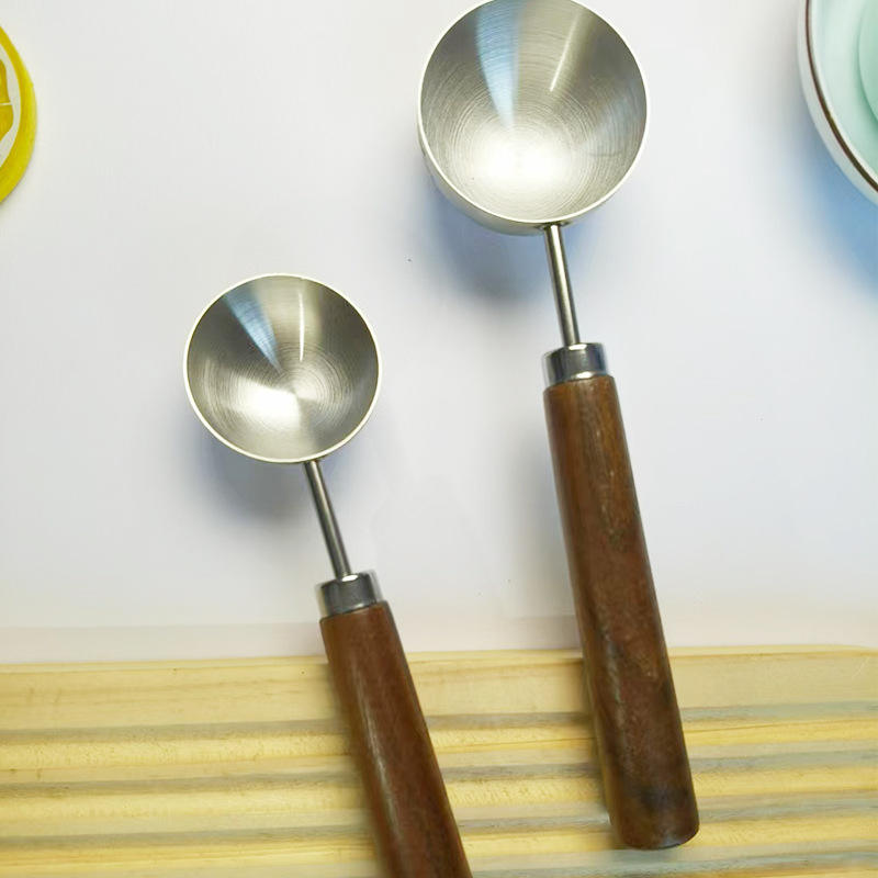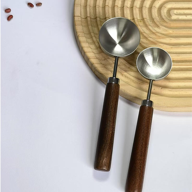 ช้อนตวงกาแฟวินเทจแบบใช้ซ้ำได้ ช้อนตวงสแตนเลสแบบย้อนยุค ด้ามไม้ยาว อุปกรณ์ครัว