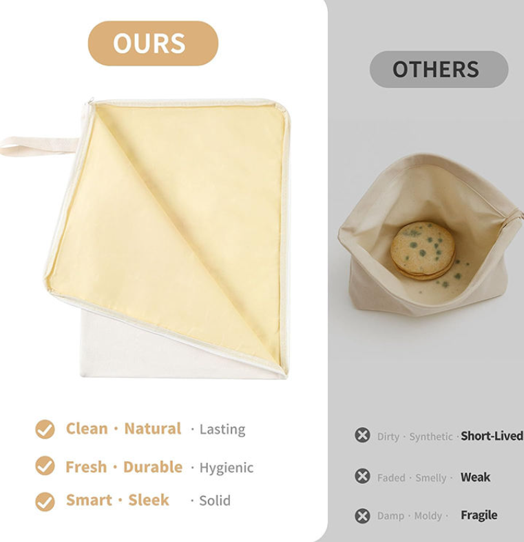 ถุงใส่ขนมปังทำจากผ้าฝ้ายธรรมชาติเคลือบขี้ผึ้งออร์แกนิคแบบใช้ซ้ำได้ ซิปกว้าง ใช้งานง่าย