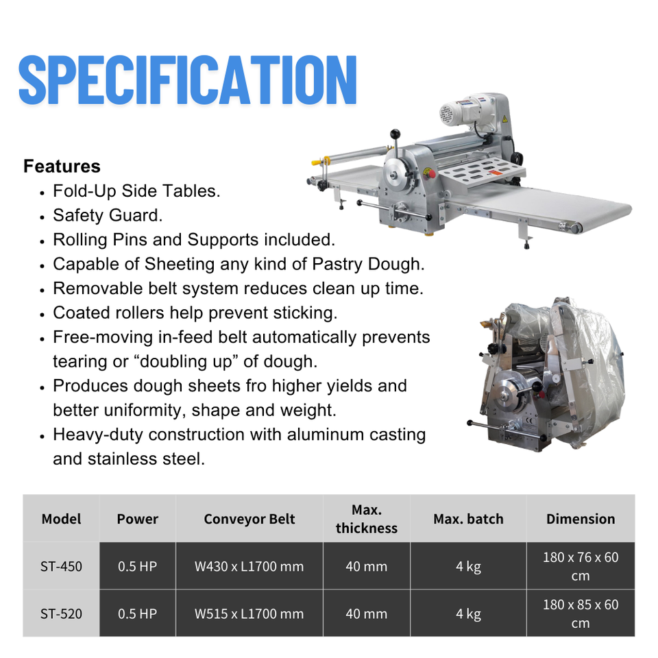 เครื่องรีดแป้งแบบสายพานกลับด้านได้ สำหรับทำพิซซ่า ขนมปัง และแป้งอื่นๆ อุปกรณ์เบเกอรี่ ผลิตในไต้หวัน