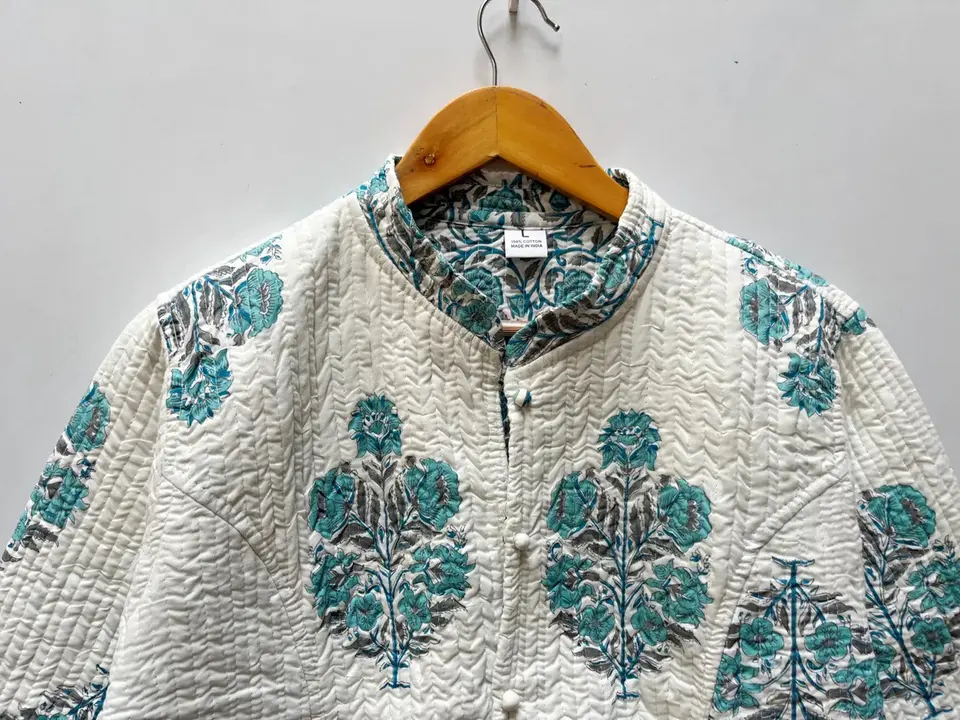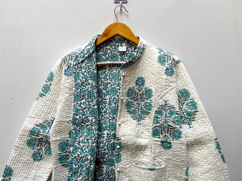 แจ็กเก็ตผ้าฝ้ายผู้หญิงพิมพ์ลายดอกไม้สีฟ้าใส่ได้สองด้านใส่ได้100% ผ้าฝ้ายแขนยาว