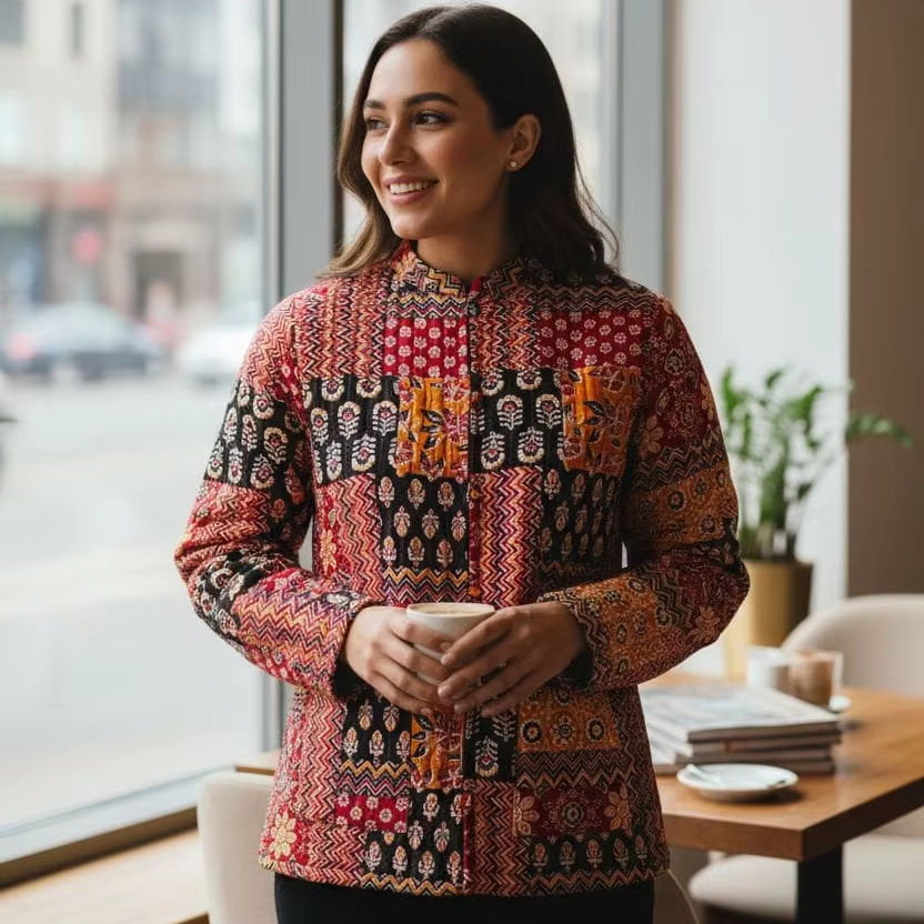 เสื้อแจ็คเก็ตผ้าฝ้ายลายปักแบบกลับด้านได้สไตล์ชาวชาวปั๊จปุระ สำหรับผู้หญิง ทำมือ งานฝีมือพื้นเมือง เสื้อกันหนาวแสนสบาย