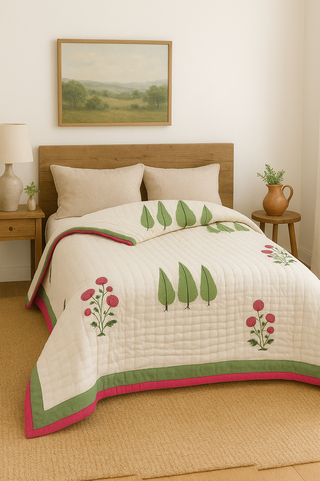 ผ้านวมผ้าฝ้ายพิมพ์ลายดอกไม้สีเขียวไซเปรสสีชมพูแบบเรียบง่ายไม่ก่อให้เกิดอาการแพ้300TC รงควัตถุแบบย้อนกลับได้