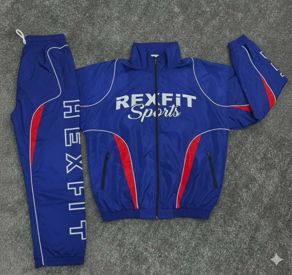 ชุดวอร์ม Rexfit OEM แบบมีโลโก้สะท้อนแสง ผลิตจากผ้าโพลีเอสเตอร์ผสมคอตตอน สำหรับผู้ชาย พิมพ์ลายสองชิ้น ชุดวอร์มแบบมีซิป ชุดกันลมสำหรับผู้ชาย