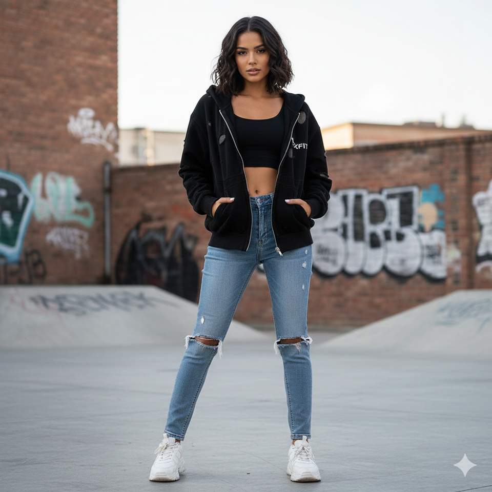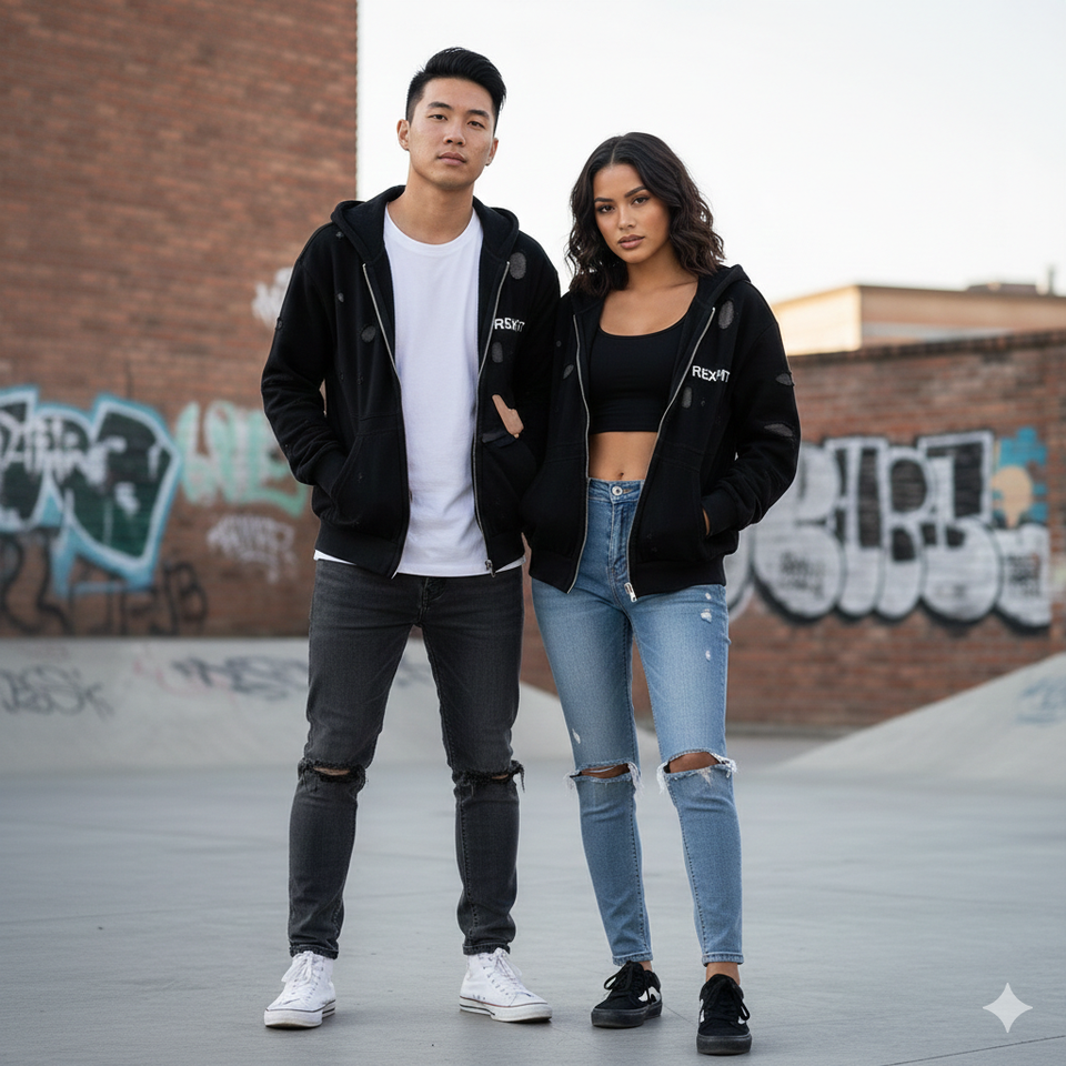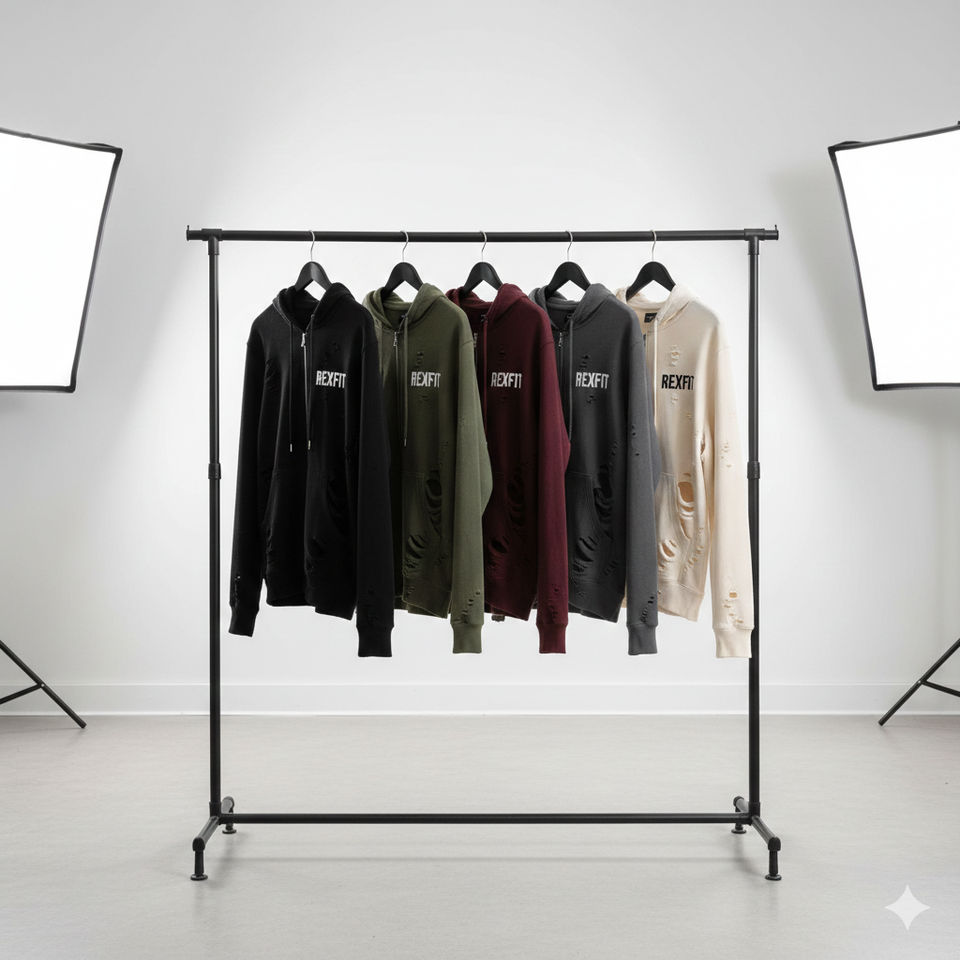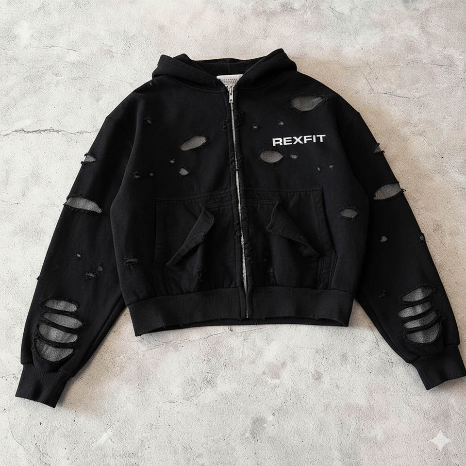 เสื้อฮู้ดดี้ Rexfit Sports แบบซิป ปักลาย แอพพลิเคชั่น ผ้าฝ้ายฟอกสี ซิปคาร์โก้ ทรงขาบาน แบบสองชั้น และชุดเสื้อฮู้ดดี้