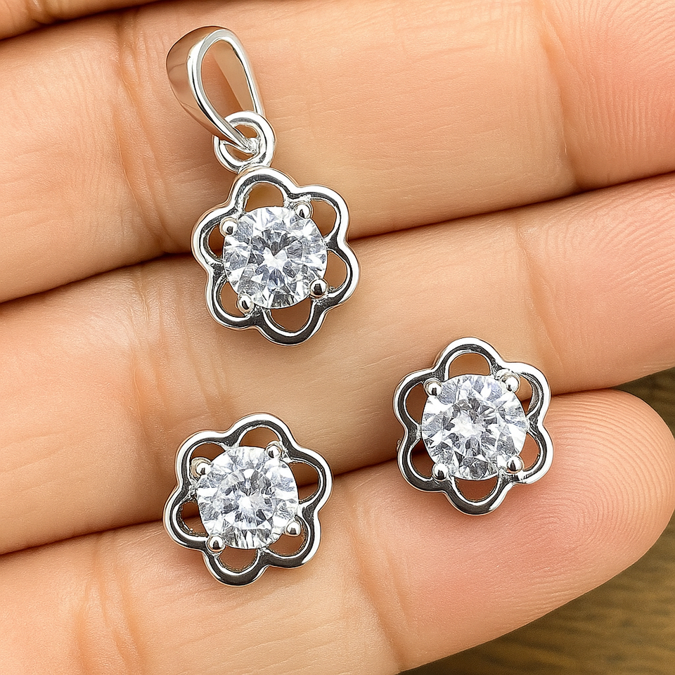ชุดเครื่องประดับเงินแท้ 925 ชุบโรเดียม Rhaya Jewels ชุด 3 ชิ้น สำหรับผู้หญิง ประดับด้วยเพชรคิวบิกเซอร์โคเนีย รูปดอกไม้ สร้อยคอ ต่างหู ของขวัญงานแต่งงาน งานเลี้ยง