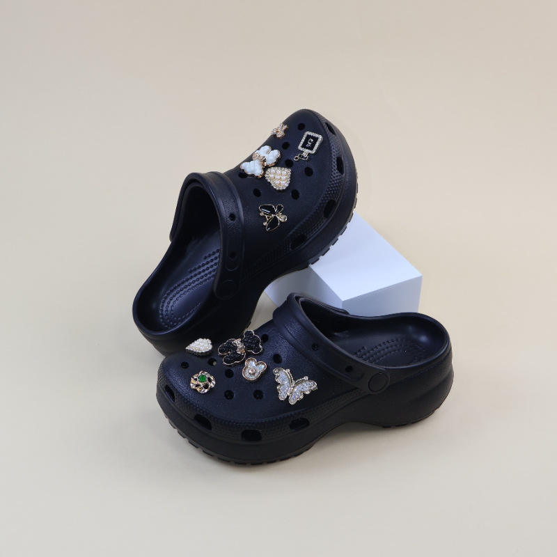 รองเท้าคร็อกส์ประดับเพชรสำหรับผู้หญิง พื้นหนานุ่ม สวมใส่สบาย เหมาะสำหรับฤดูร้อนและชายหาด สีชมพู สีกากี สีดำ สีขาว ส้นสูง 3 ซม. สไตล์โฟร์ซีซั่นส์