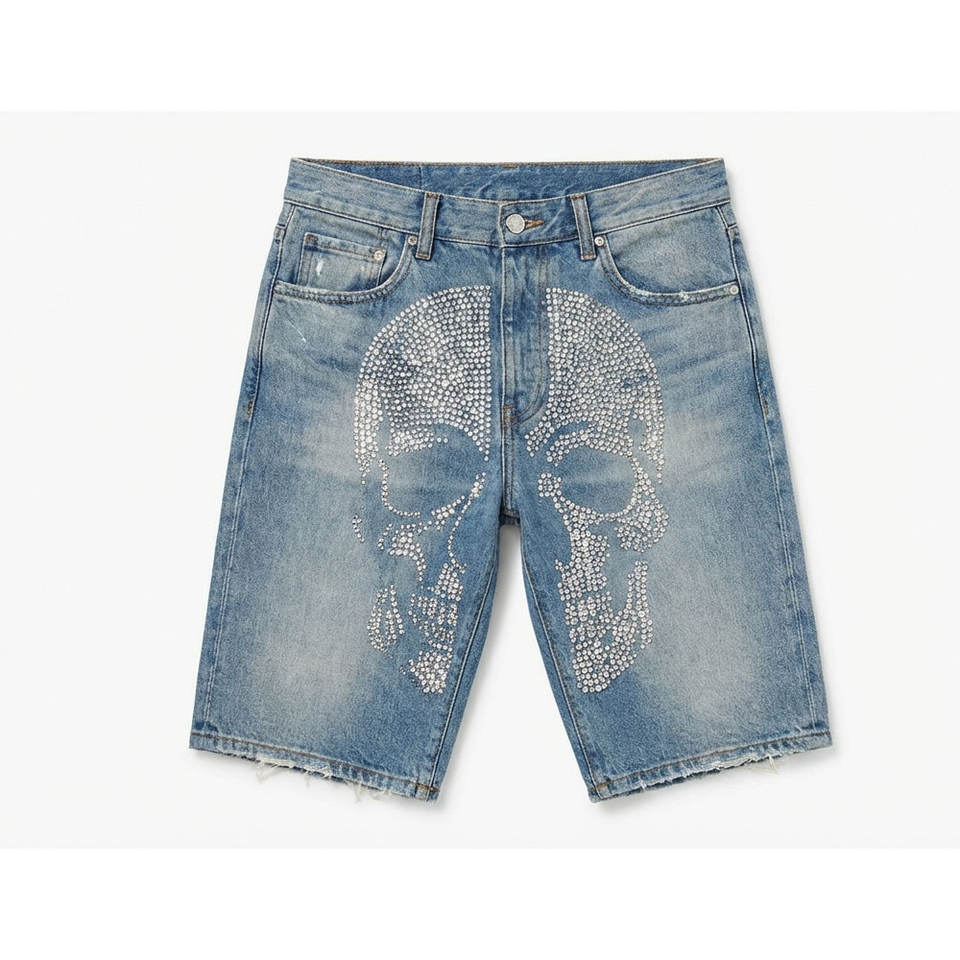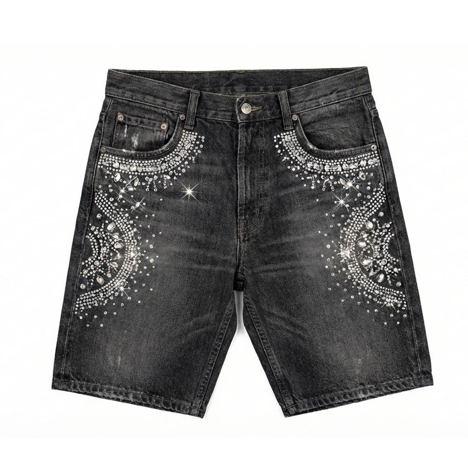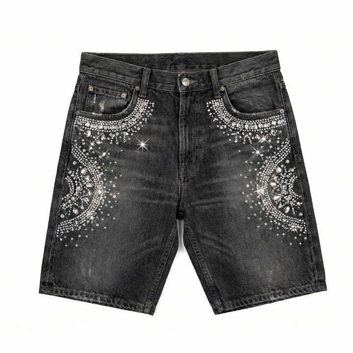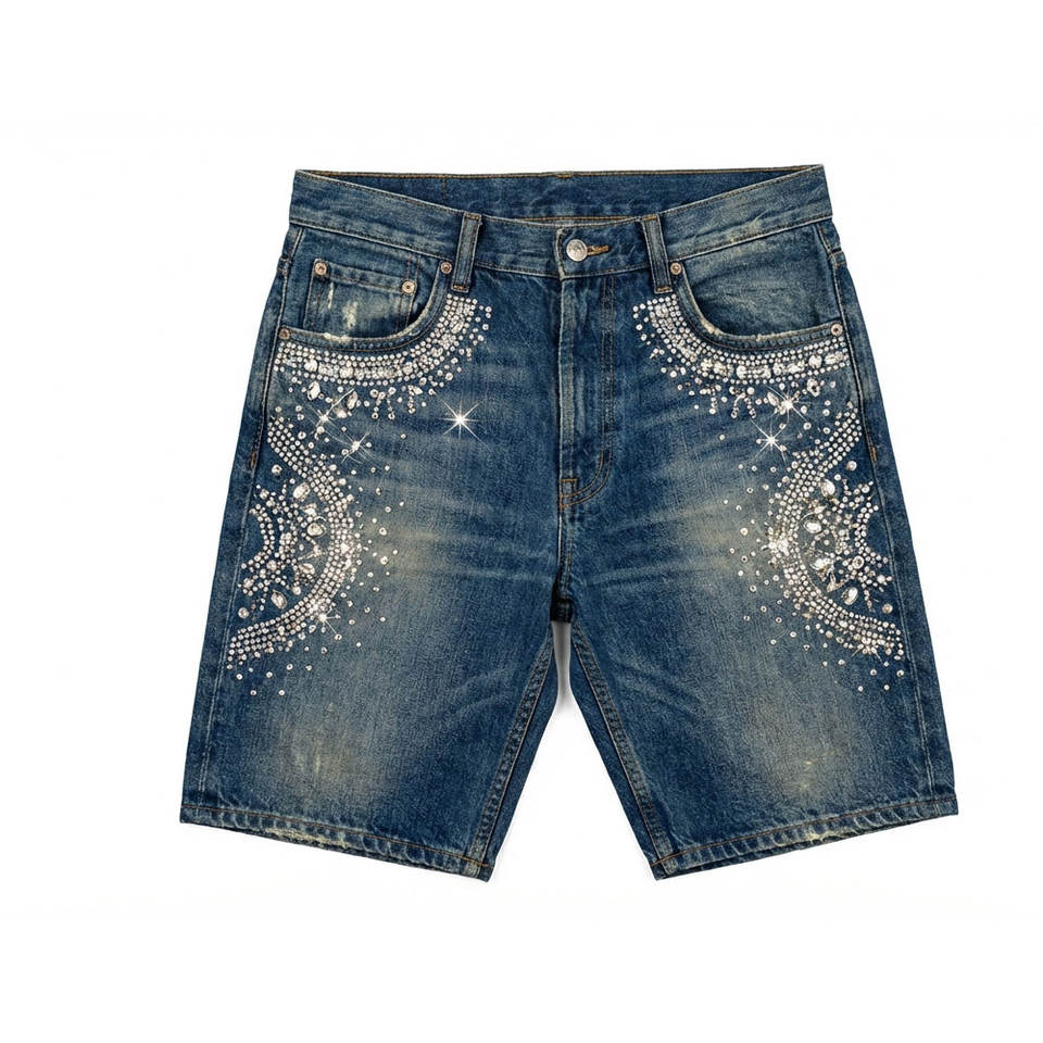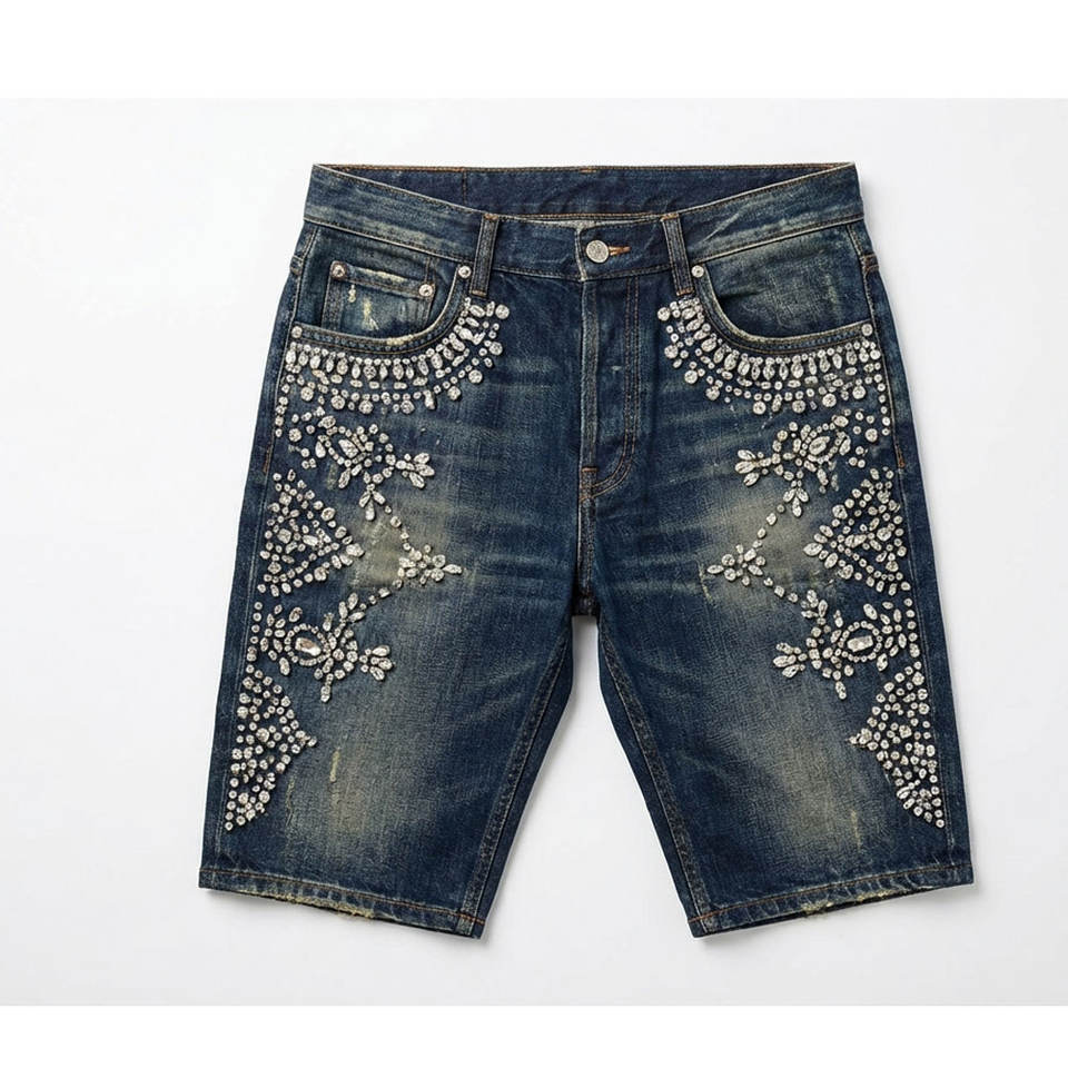 กางเกงยีนส์ขาสั้นประดับเพชรเทียม โรงงาน OEM รับออกแบบ ผลิตตามสั่ง ผลิตจำนวนมาก รองรับแบรนด์ส่วนตัว และบริการส่งออก