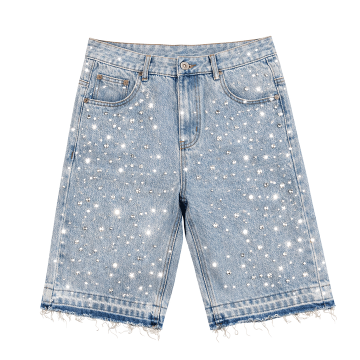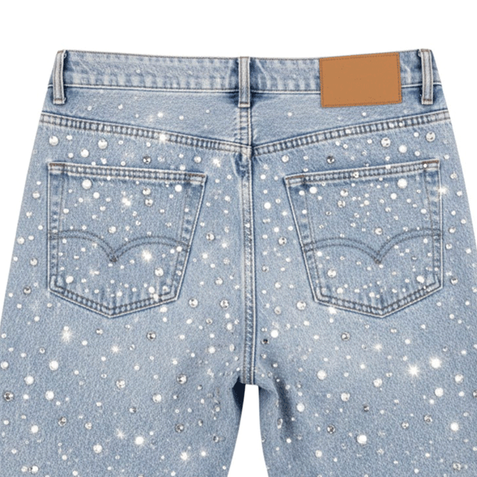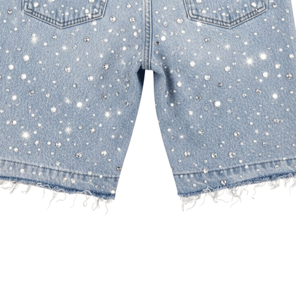 โรงงานผลิตกางเกงยีนส์ขาสั้นประดับด้วยคริสตัล ตะเข็บเสริมความแข็งแรง การบำบัดผ้าขั้นสูง การควบคุมคุณภาพ