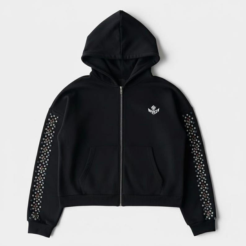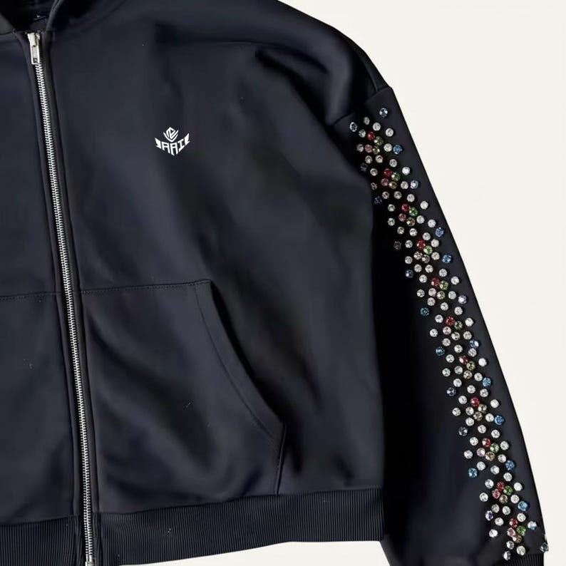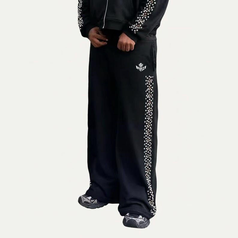 ชุดฮู้ดดี้และกางเกงจ็อกเกอร์ประดับเพชรเทียม รับทำโลโก้ เสื้อผ้าสตรีทแวร์แบบยูนิเซ็กซ์ ผ้าฝ้ายฟลีซ รับผลิตแบบ OEM ODM ขายส่งในสหรัฐอเมริกา