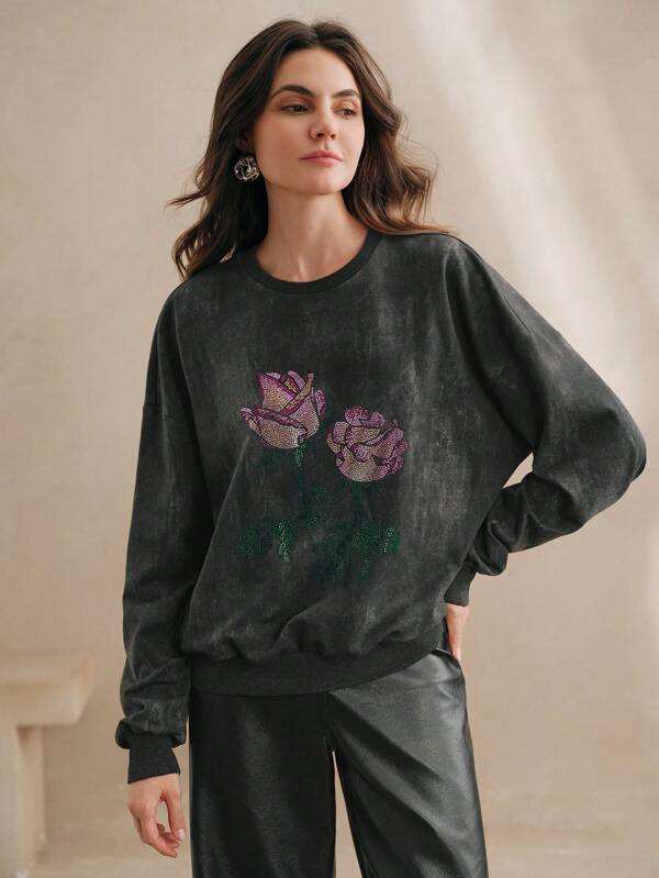 เสื้อสเวตเตอร์งานศิลปะลายดอกกุหลาบพลอยเทียมเสื้อสเวตเตอร์คอกลมแขนยาวลายดอกไม้กราฟิกสวมใส่สบาย