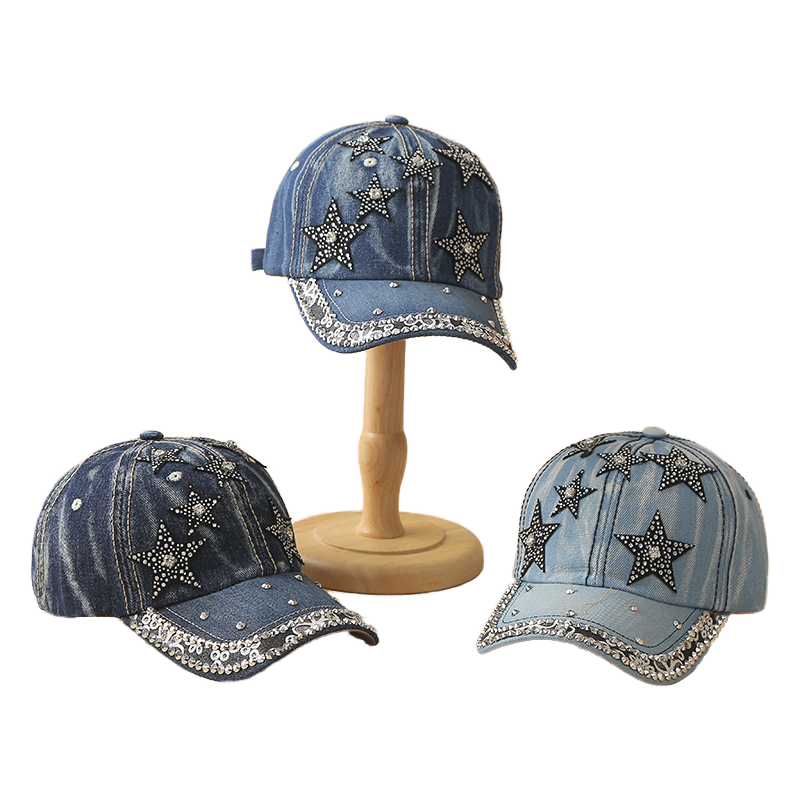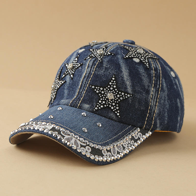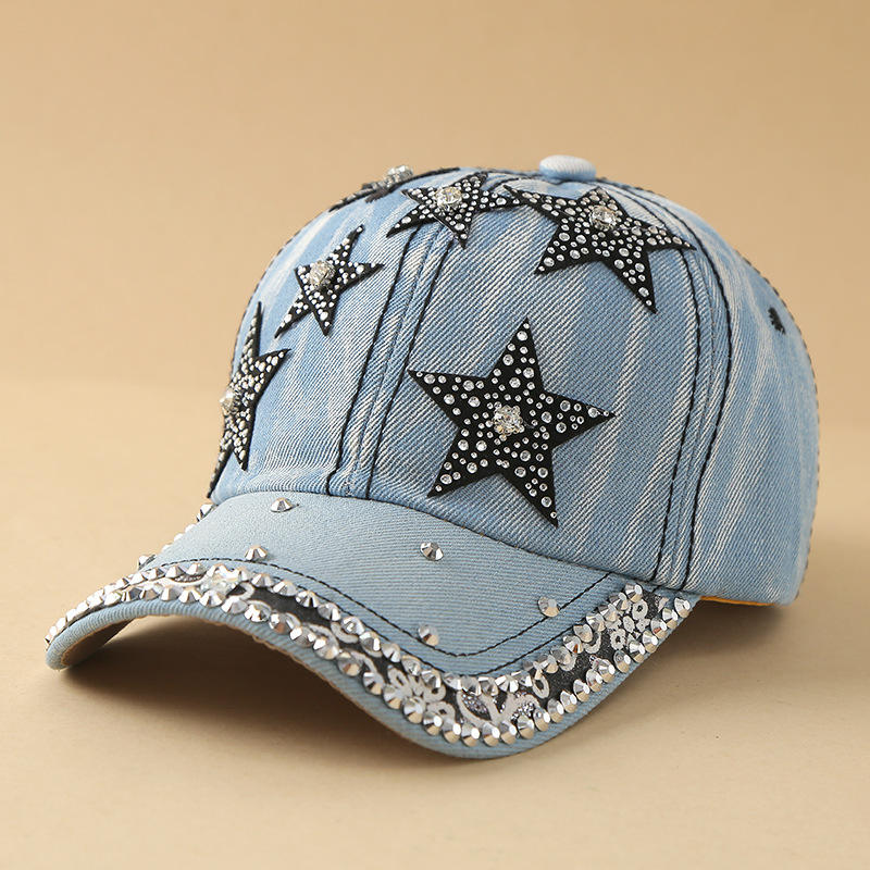 Rhinestone Star Denim Baseball Cap Vintage Washed Adjustable Street Style Fashion Bling Four Seasons Hat