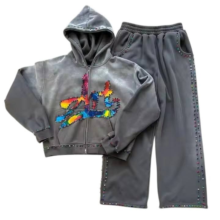 ชุดวอร์มมีฮู้ดแบบมีซิปติดโลโก้ออกแบบได้ตามต้องการมีฮู้ดทรงหลวมกางเกงมีฮู้ดซักด้วยกรดชุดวอร์มพิมพ์ DTF เต็มรูปแบบ
