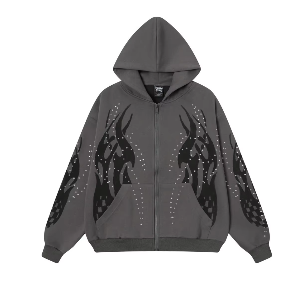 เสื้อมีฮู้ดพิมพ์ลายเปลวไฟประดับพลอยเทียมสำหรับผู้ชายผู้หญิงเสื้อผ้าแนวสตรีทไซส์ใหญ่พิเศษมีฮู้ดระยิบระยับแฟชั่นใส่ได้ทั้งชายและหญิงสุดหรูฮิปฮอปฤดูใบไม้ร่วงฤดูหนาว