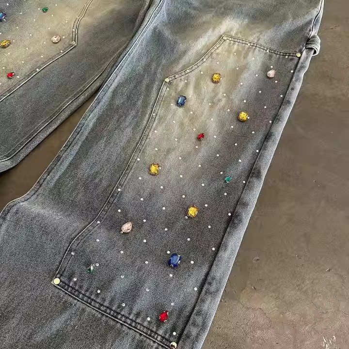 กางเกงยีนส์กระดุมเพชร แต่งขอบขาด ดีไซน์เข่าคู่ ทรงช่าง ปะผ้าสามชิ้น ทรงหลวม ล้างแบบ Monkey Wash ทรงกว้าง ใส่ได้ทั้งฤดูร้อนและฤดูใบไม้ร่วง
