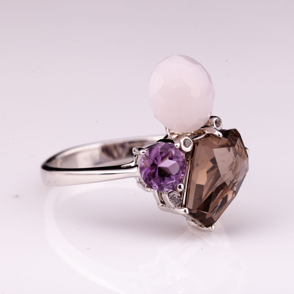 จานโรเดียมเงิน925แหวนพลอยธรรมชาติสีชมพูโอปอลอเมทิสต์สีขาวบุษราคัมและควอตซ์ควันราคาโรงงาน