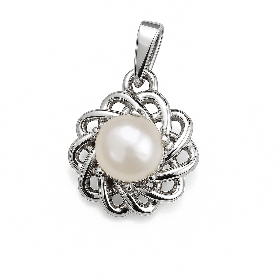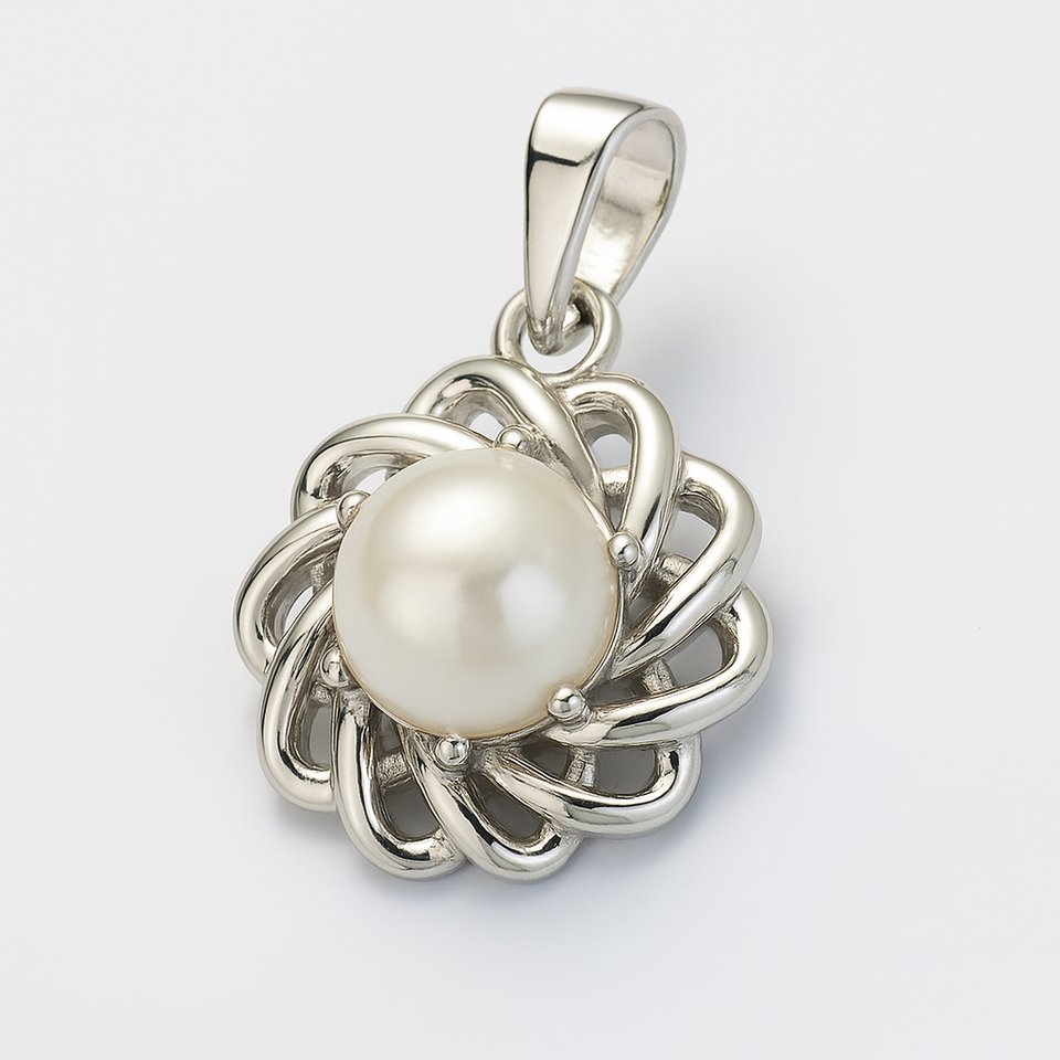 จี้ไข่มุกกลมชุบโรเดียมพร้อมเครื่องประดับเงินลายดอกไม้สำหรับสตรีสไตล์มินิมอล