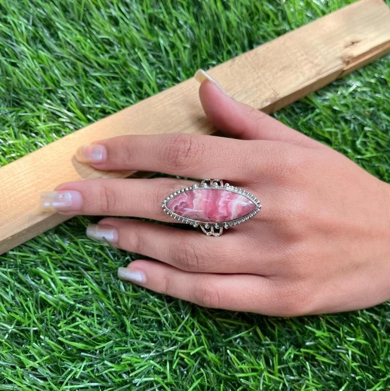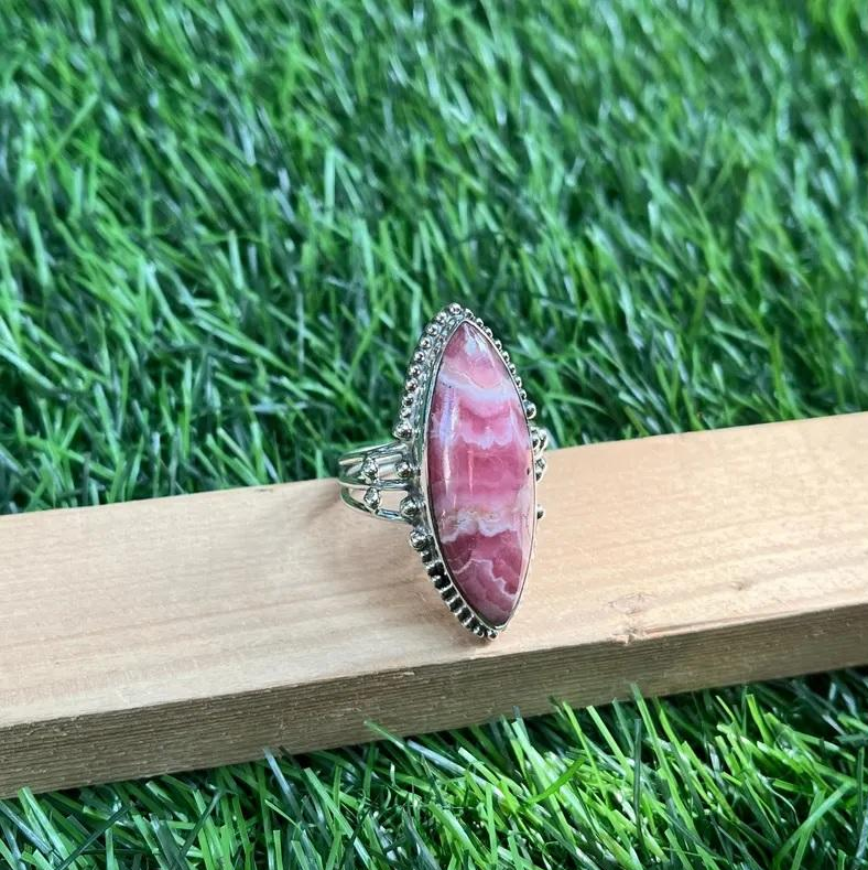 แหวนพลอยโรโดโครไซต์สีชมพู ทำด้วยมือ เงินแท้ 925 สไตล์โบฮีเมียน เครื่องประดับงานแต่งงาน ดีไซน์โดดเด่นไม่ซ้ำใคร ของขวัญสำหรับผู้หญิง