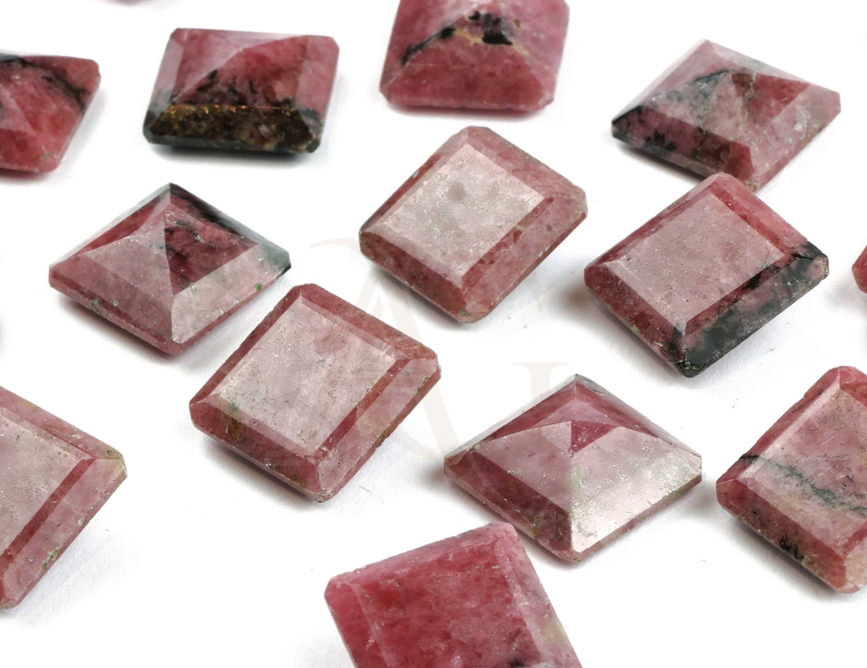 พลอยโรโดไนต์ทรงเหลี่ยมตัดขนาด10มม. หินอัญมณีสีชมพูทึบแสงสีเงิน