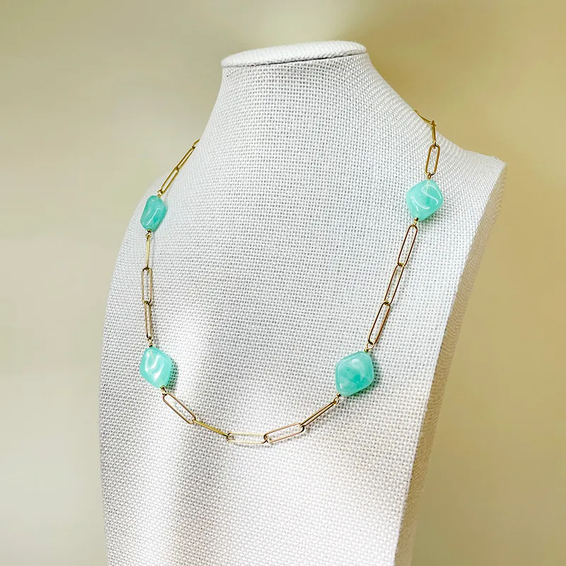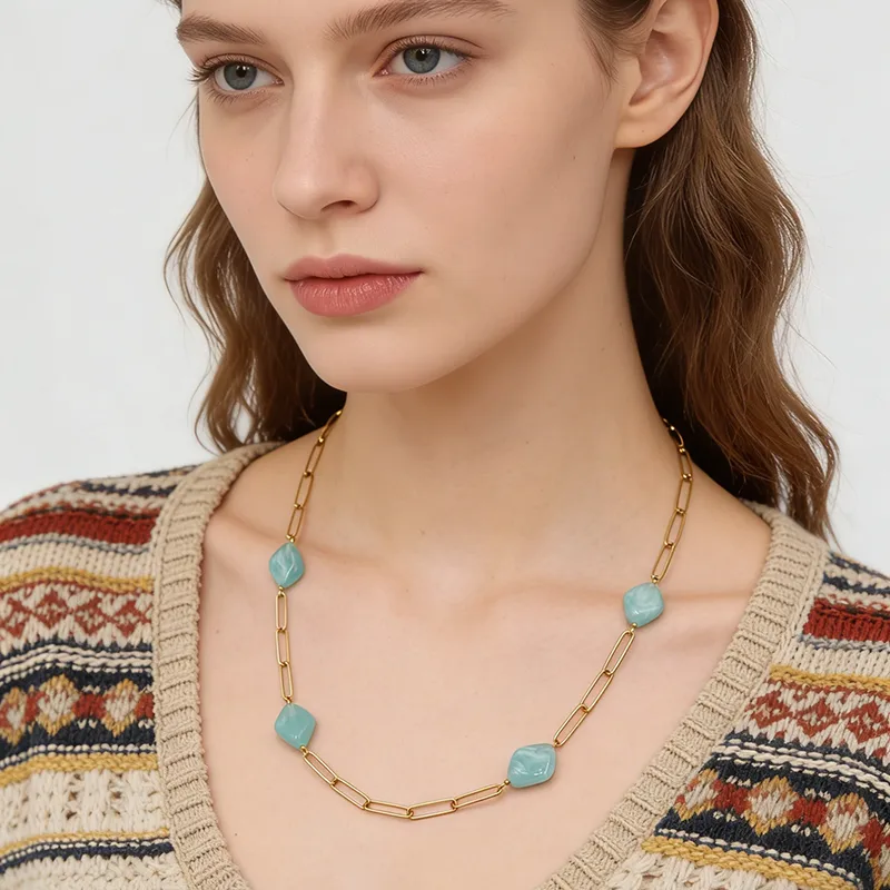 สร้อยคอรูปทรงสี่เหลี่ยมขนมเปียกปูนสำหรับทุกเพศ กันน้ำ ทำจากสแตนเลส 304 ชุบทอง 18K โซ่แบบคลิปหนีบกระดาษ ขนาด 0.03-0.05 ไมครอน
